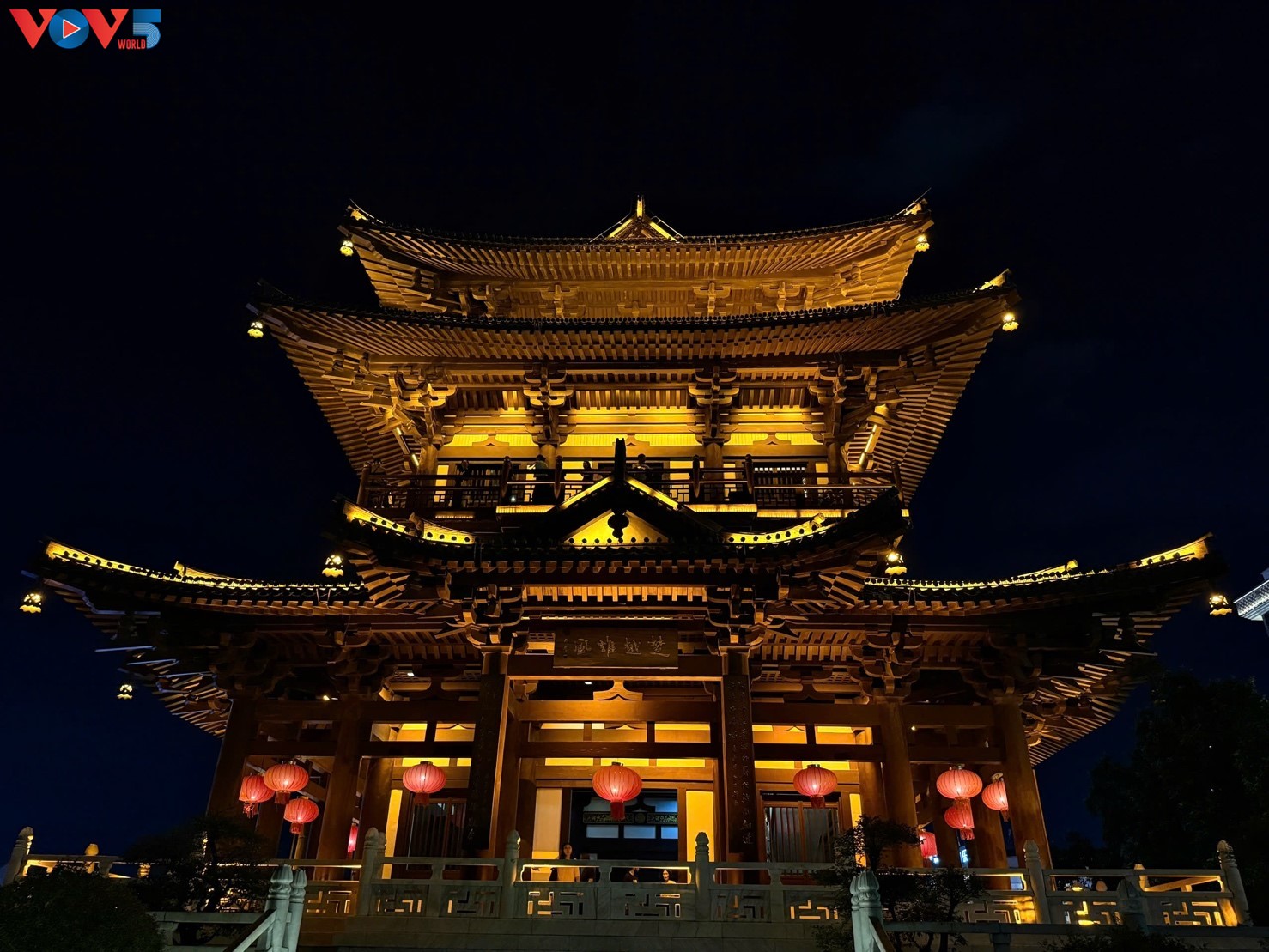 Đứng từ trên đỉnh Tháp Tiêu Dao, du khách có thể phóng tầm mắt ngắm nhìn dòng sông Li Giang rực rỡ ánh đèn và đỉnh Liyong trùng điệp phía xa.