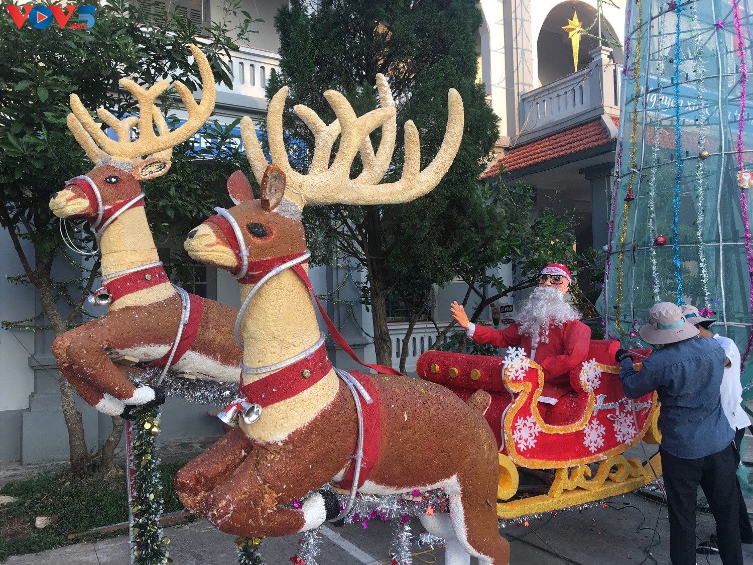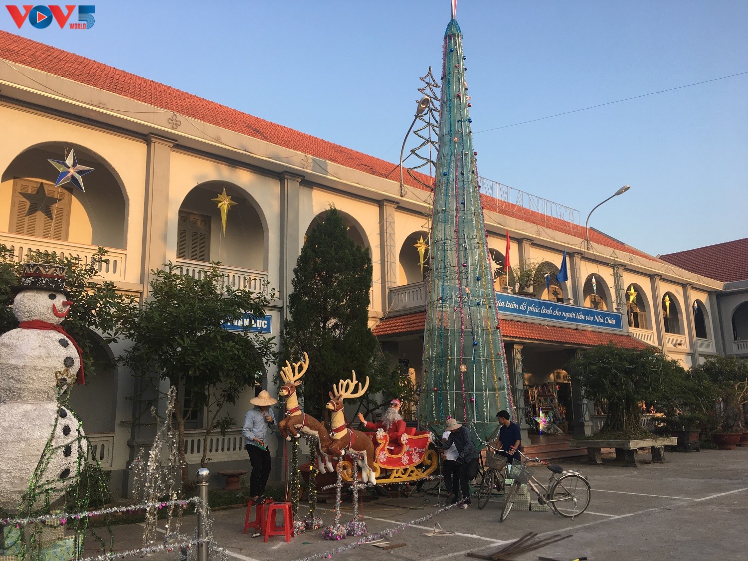 Một cây thông noel khác nhỏ hơn, bên trên gắn ngôi sao noel cũng được dựng ngay trước Trung tâm mục vụ của giáo phận Phát Diệm. Bên dưới cây thông, người tuyết, ông già noel, hang đá belem đang được khẩn trương trang trí để xong trước ngày đại lễ.