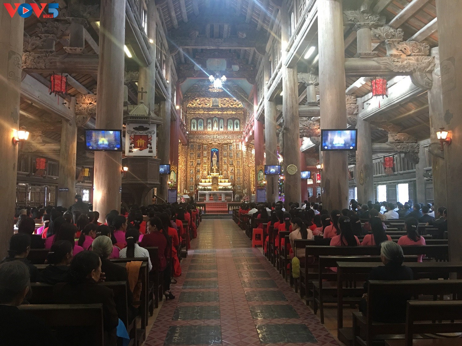 Tại trung tâm nhà thờ Phát Diệm, một câu thông Noel cao hơn chục mét được dựng lên từ nhiều ngày nay tạo nên sự khác biệt trong khuôn viên ngôi nhà thờ cổ này.