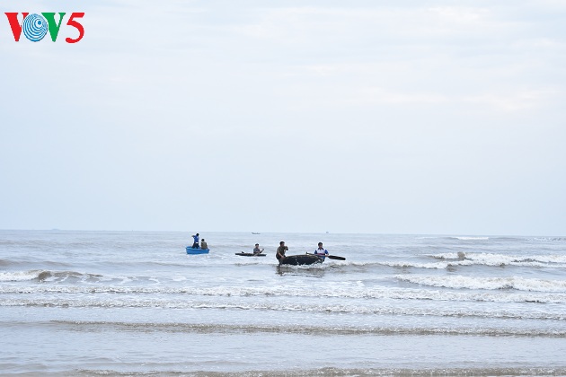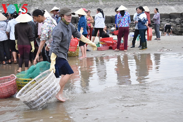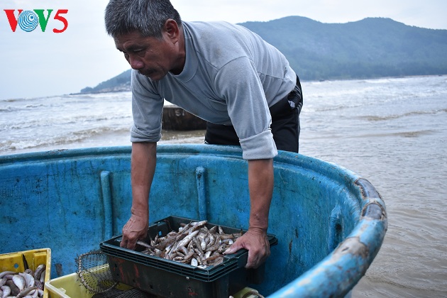 Hải sản được ngư dân đưa vào bờ bằng những chiếc thuyền mủng.