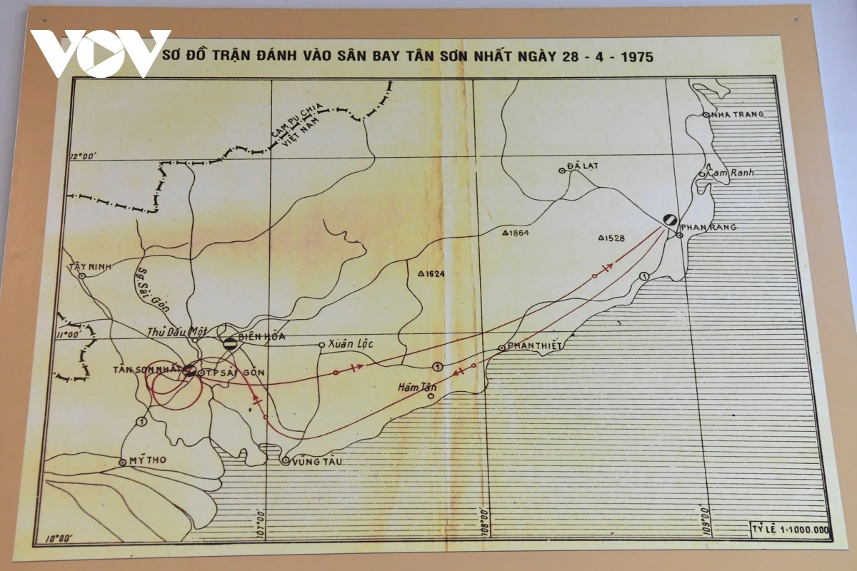 | Sơ đồ trận đánh của phi đội Quyết Thắng. Chiều ngày 28/4/1975, phi đội xuất kích từ sân bay Thành Sơn (Phan Rang). Năm chiếc máy bay A-37 bay theo đội hình gồm: Số 1 Nguyễn Thành Trung, số 2 Từ Đễ, số 3 Nguyễn Văn Lục, số 4 gồm Hoàng Mai Vượng và Trần Văn On, số 5 Hán Văn Quảng. Sau khi oanh tạc sân bay Tân Sơn Nhất, phi đội trở về sân bay Thành Sơn. |
