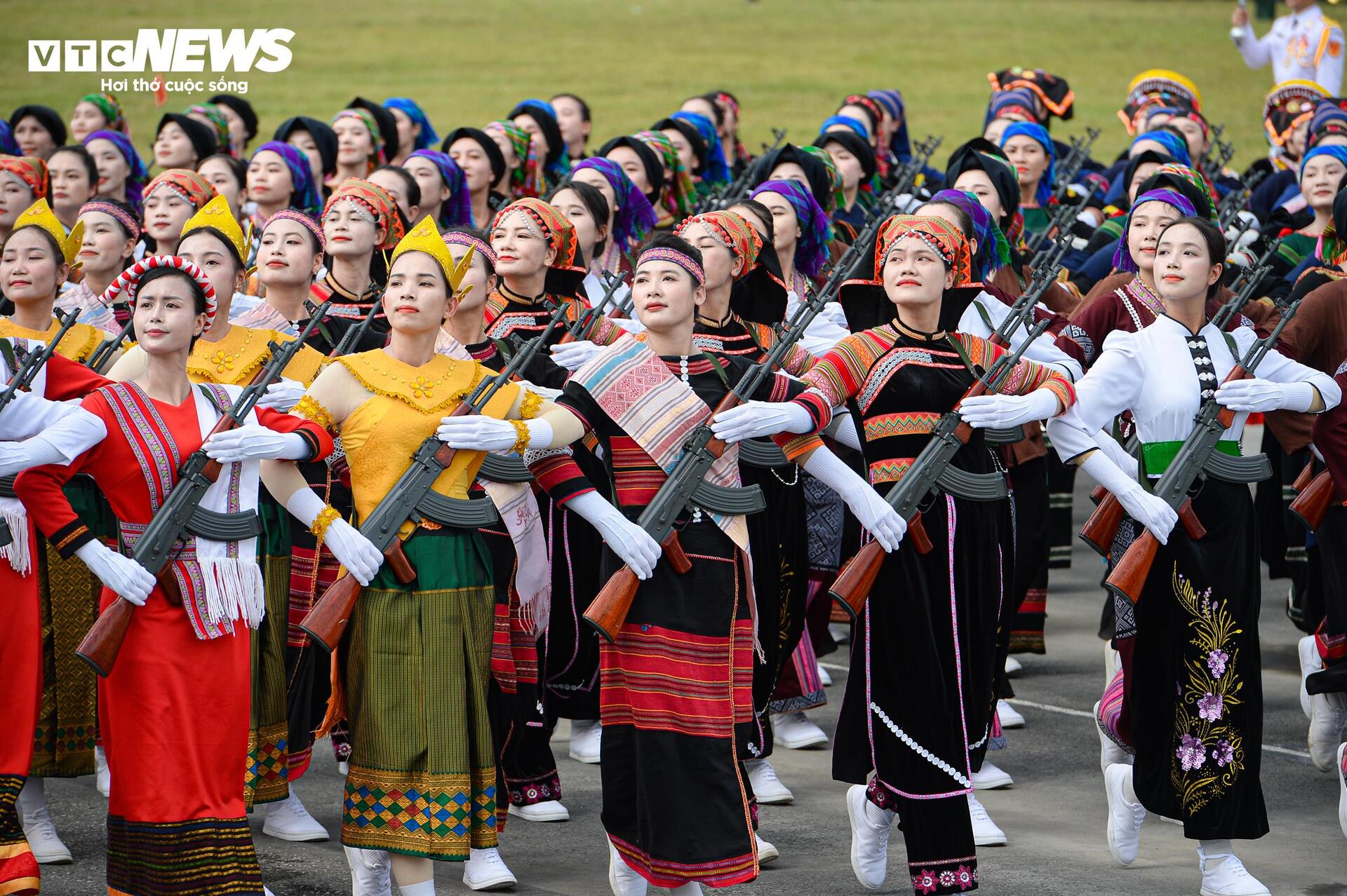 | Hình ảnh khối nữ Dân quân các dân tộc tại buổi tổng hợp luyện sáng 5/8. |