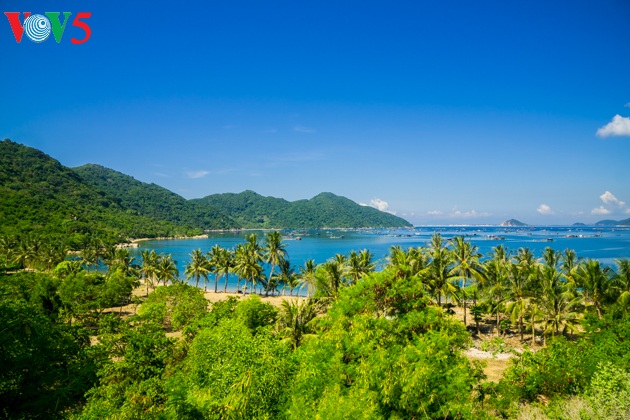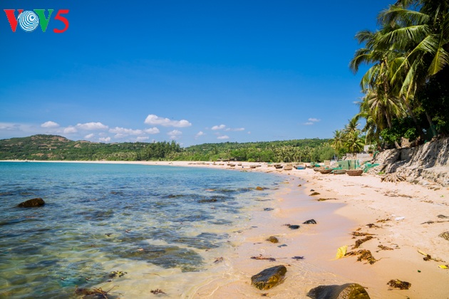 Rặng dừa e ấp, xóm chài nép mình bên biển xanh trong, cát trắng, nắng vàng. |