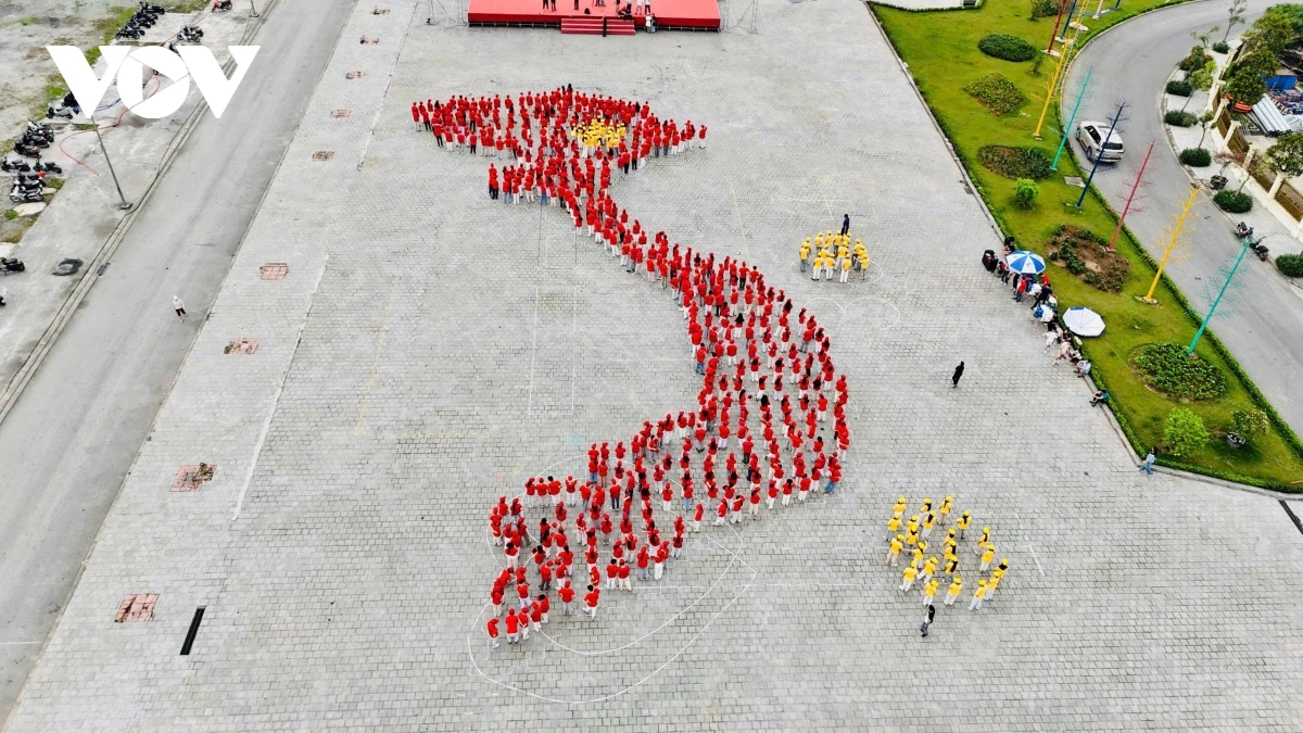 | Đây cũng là dịp nhiều trường học trên địa bàn tỉnh Quảng Ninh lựa chọn để giáo dục truyền thống yêu nước, lòng tự hào dân tộc cho học sinh. Tại thành phố Cẩm Phả, 500 học sinh tổ chức xếp hình bản đồ Việt Nam, Quốc kỳ Việt Nam, hình trái tim... Đây là những hình ảnh ý nghĩa, thể hiện niềm kiêu hãnh, niềm tự hào dân tộc của thế hệ trẻ. |