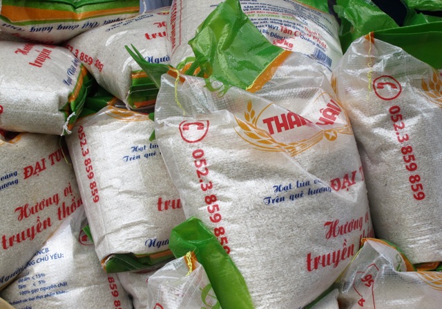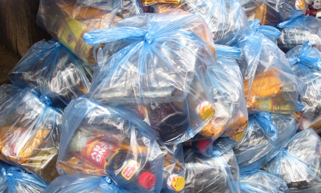 | Mắm, muối, dầu ăn, cá khô... được gói thành từng túi để tặng cho bà con dân bản. |