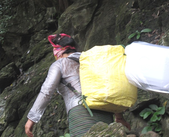 | Chiếc can đựng nước to quá đành buộc đằng sau cái gùi bằng bao tải dứa. |
