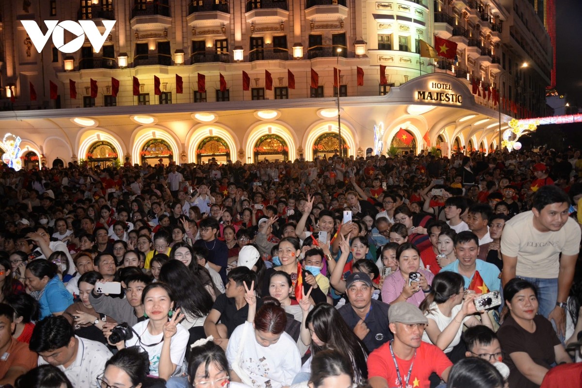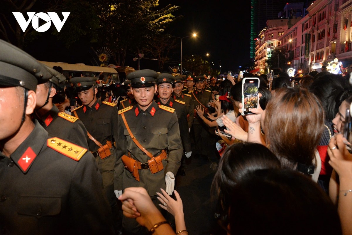 Dòng người dân vây quanh, hò reo, phấn khích khi các khối lực lượng vũ trang diễu hành đường phố, sau khi hoàn thành sơ duyệt diễu binh diễu hành qua khán đài phía trước Hội trường Thống Nhất. |
