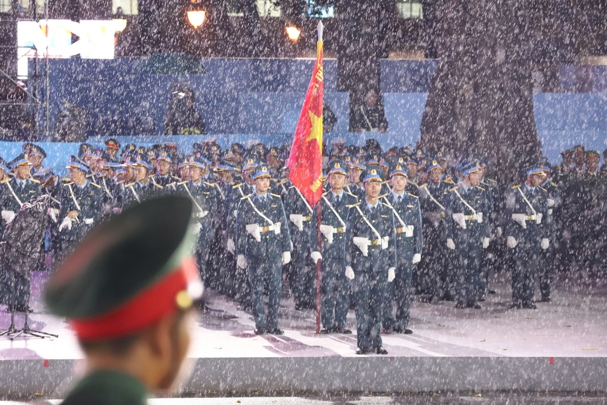 Trước giờ sơ duyệt, trung tâm TP. Hồ Chí Minh xuất hiện cơn mưa khá lớn, khiến nhiều cán bộ, chiến sĩ của các khối lực lượng vũ trang và nhiều người dân phải dầm mưa |