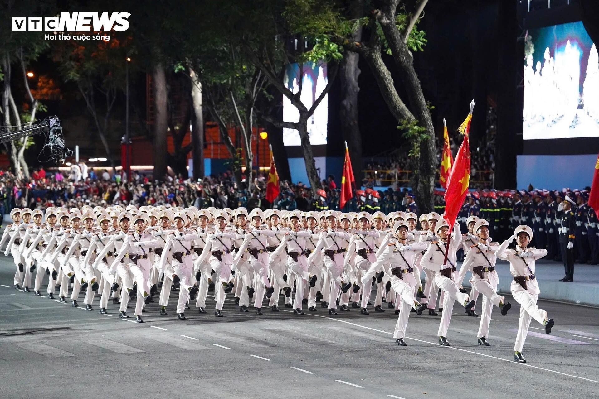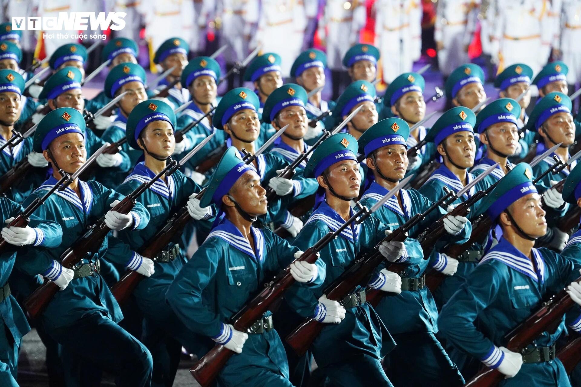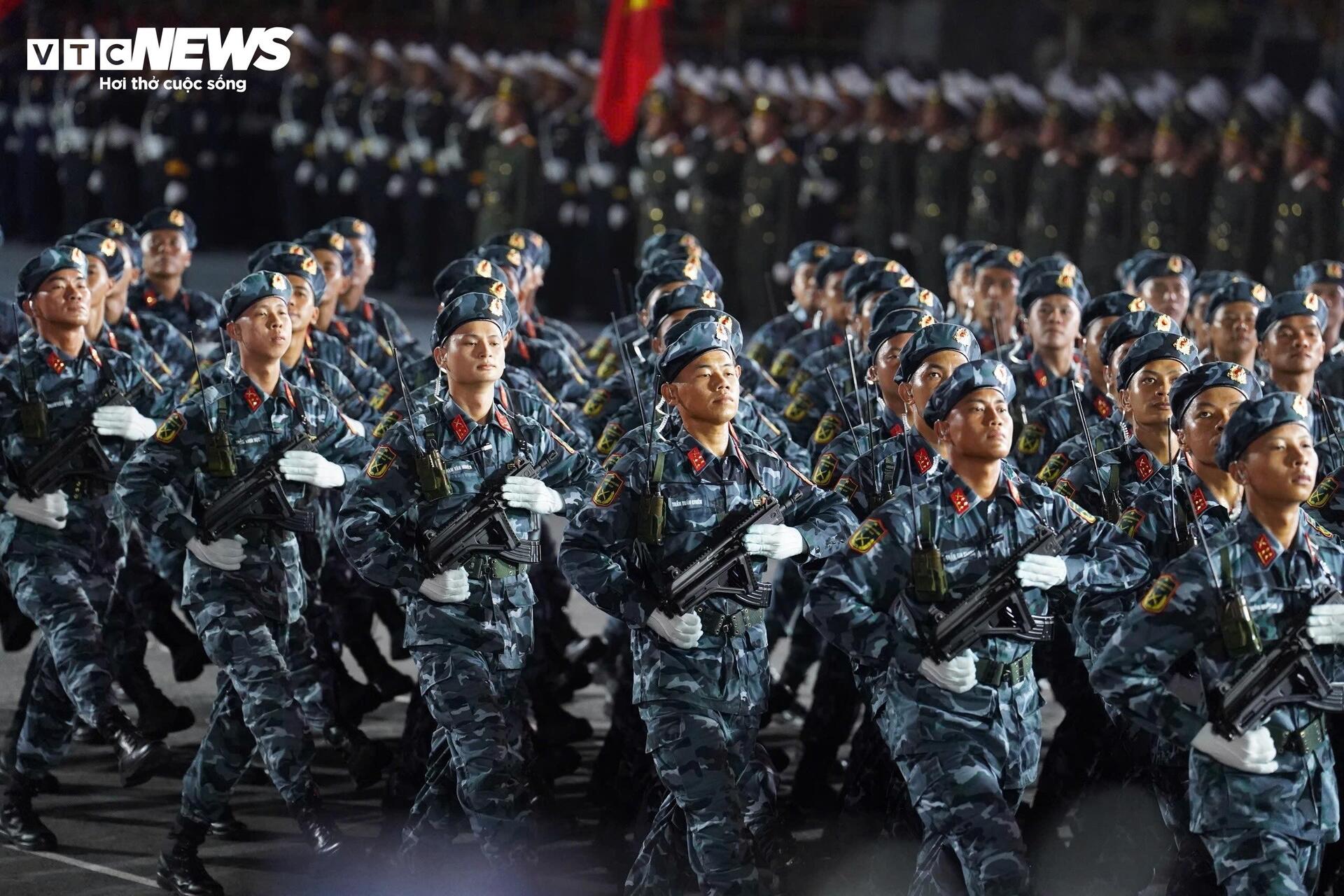 Các chiến sĩ hiên ngang bước đi trong đội hình, thể hiện tinh thần kỷ luật thép. |