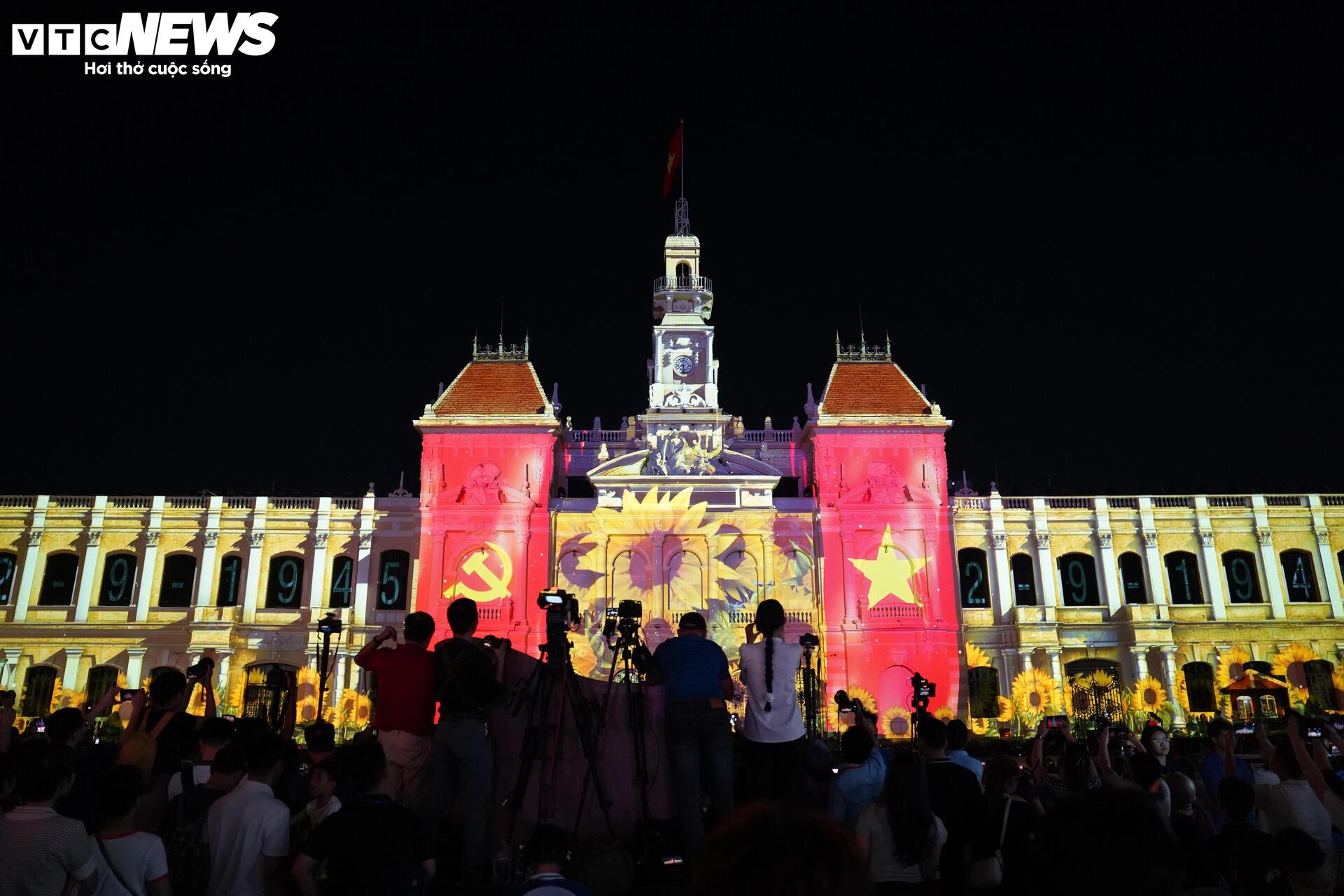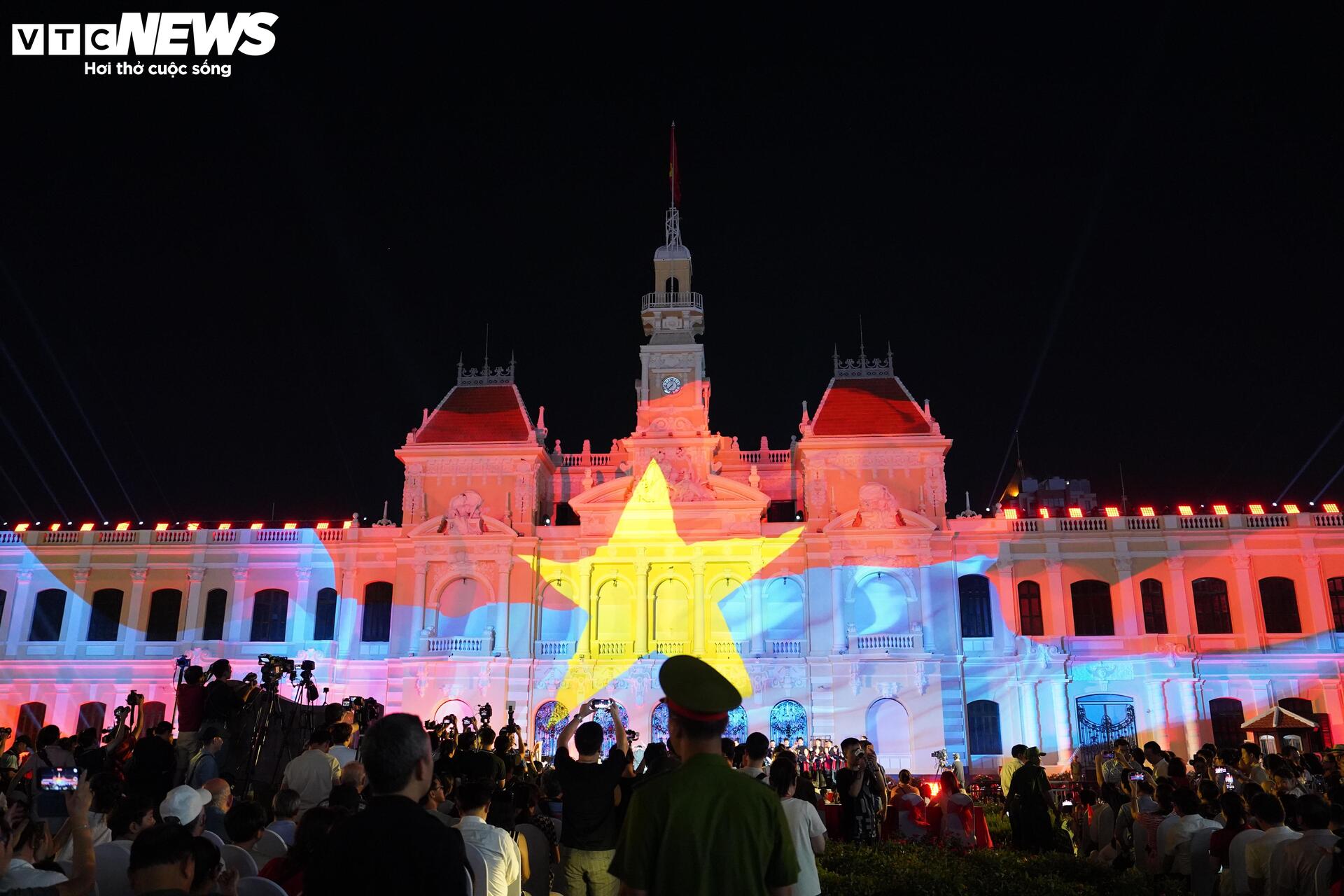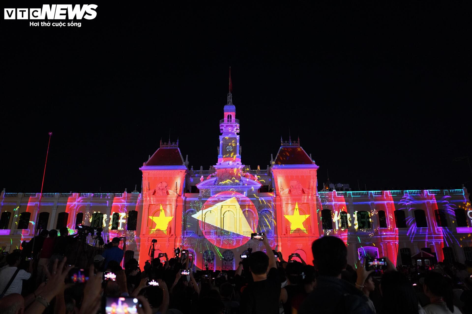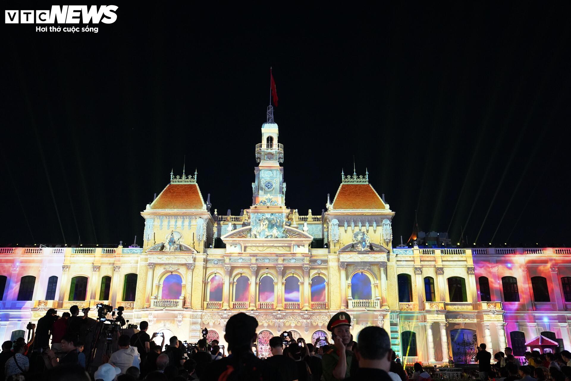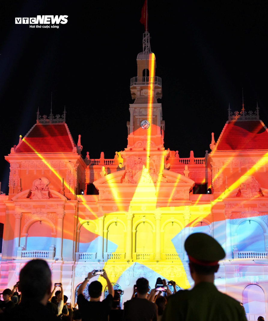 | Toàn bộ mặt tiền của Trụ sở Hội đồng Nhân dân và Ủy ban Nhân dân TP.HCM, công trình kiến trúc mang tính biểu tượng của thành phố, đã trở thành một bức tranh ánh sáng khổng lồ. |