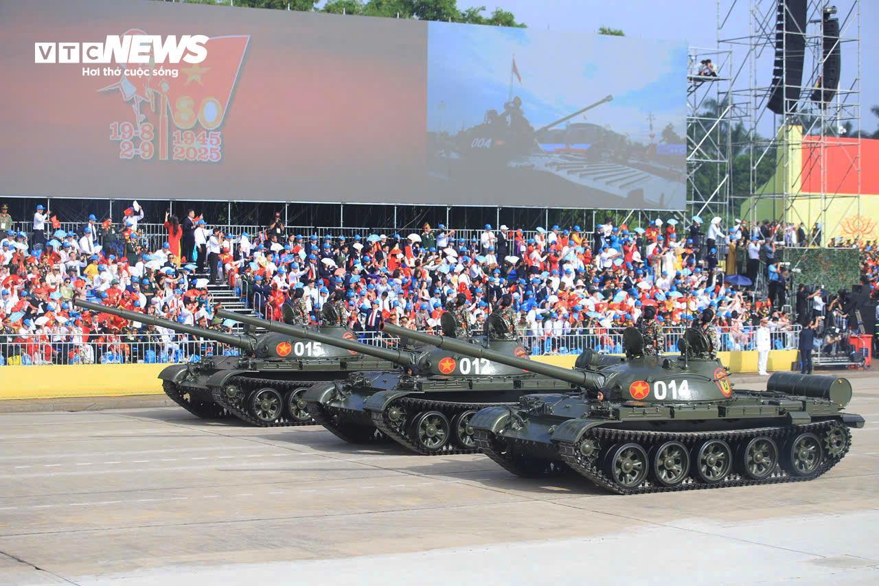 Màn phô diễn sức mạnh của lực lượng tăng thiết giáp Việt Nam có sự xuất hiện của các loại xe tăng T-54B, T-55, T-90S và T-62.
