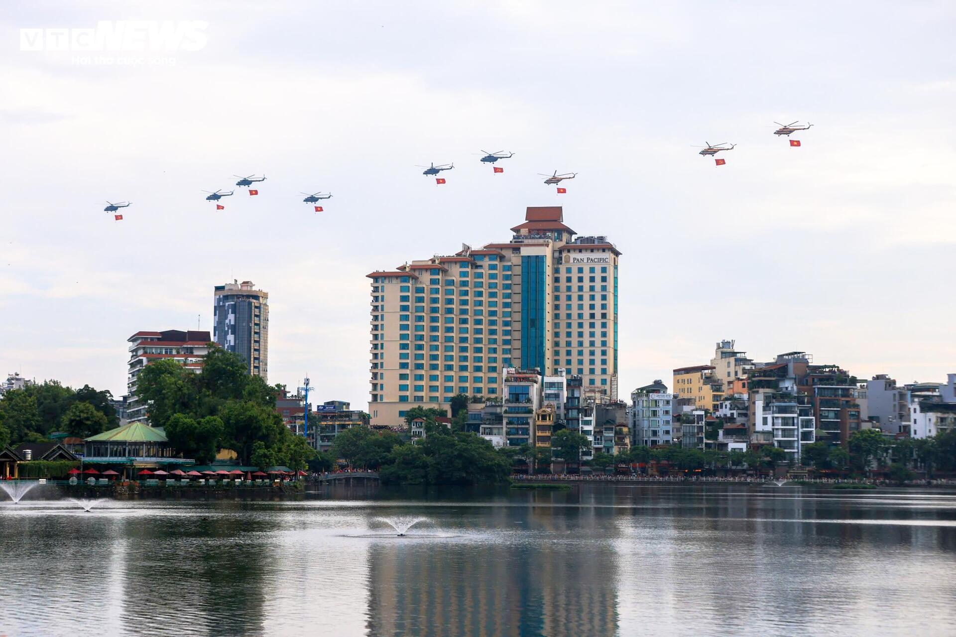 Mở đầu cuộc diễu binh, diễu hành, các biên đội của Không quân Nhân dân Việt Nam anh hùng bay trên bầu trời Tổ quốc. Dẫn đầu là biên đội trực thăng Mi-171, Mi-17, Mi-8, mang cờ Đảng, cờ Tổ quốc tung bay trên bầu trời Hà Nội.