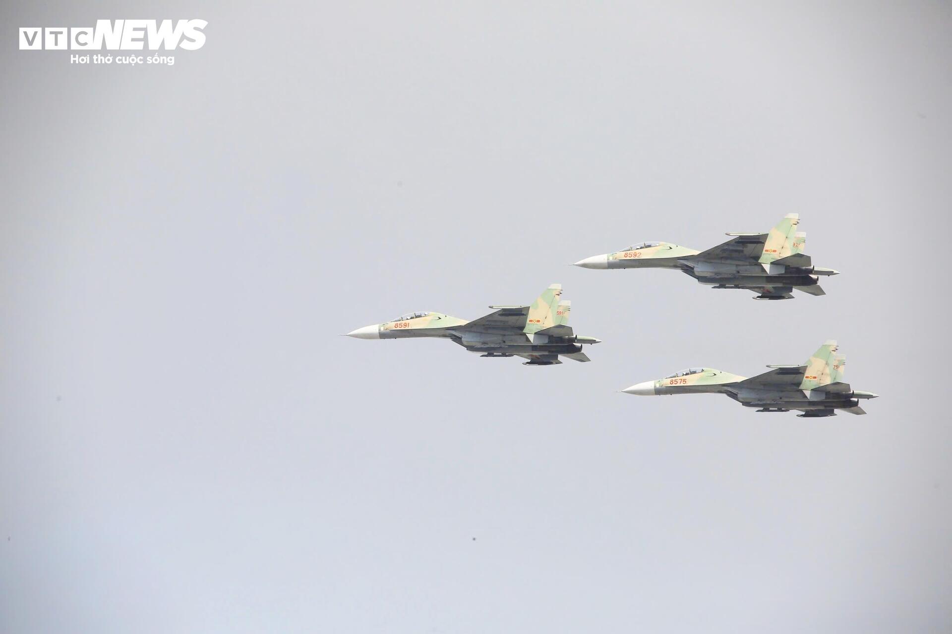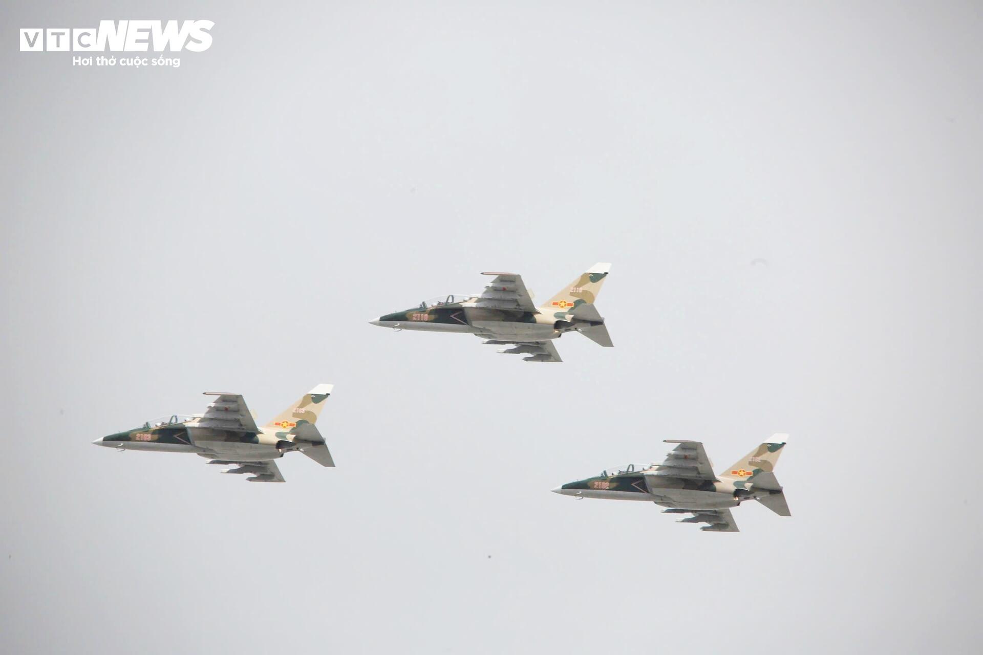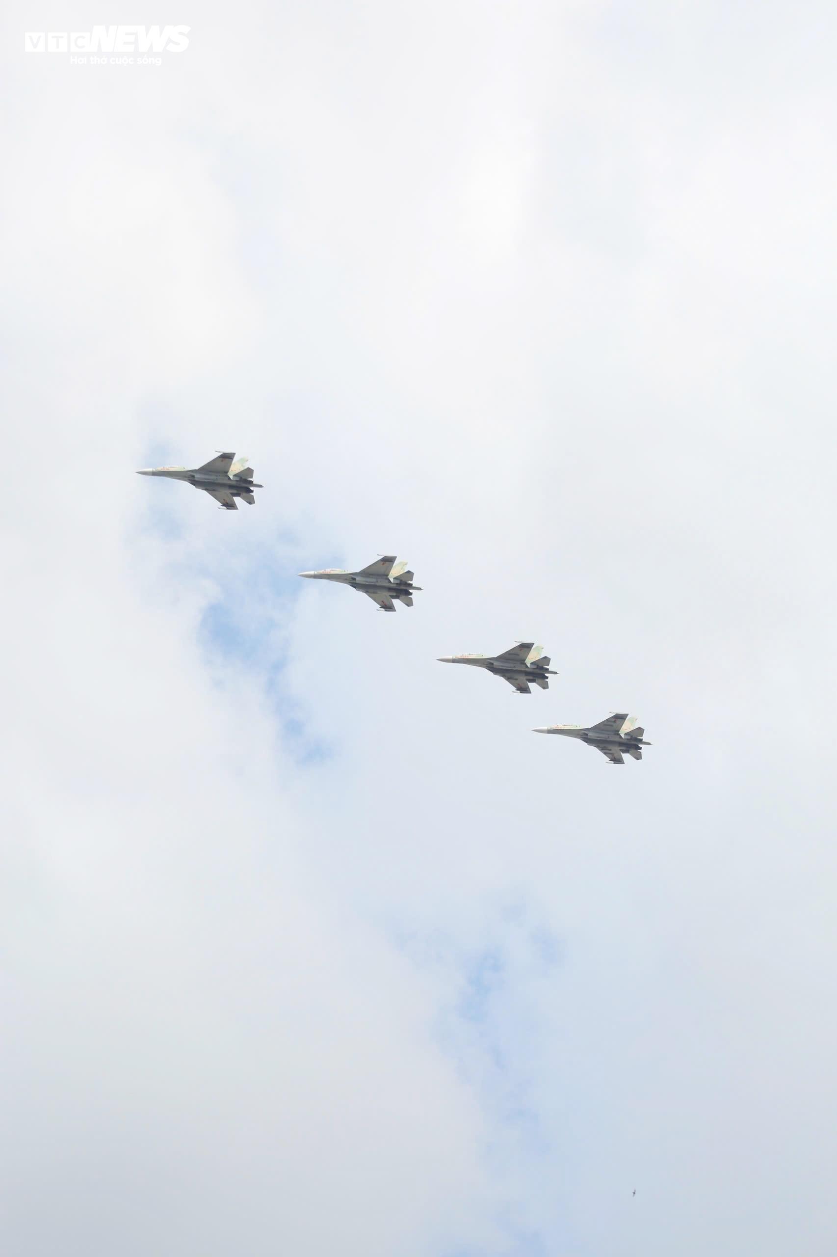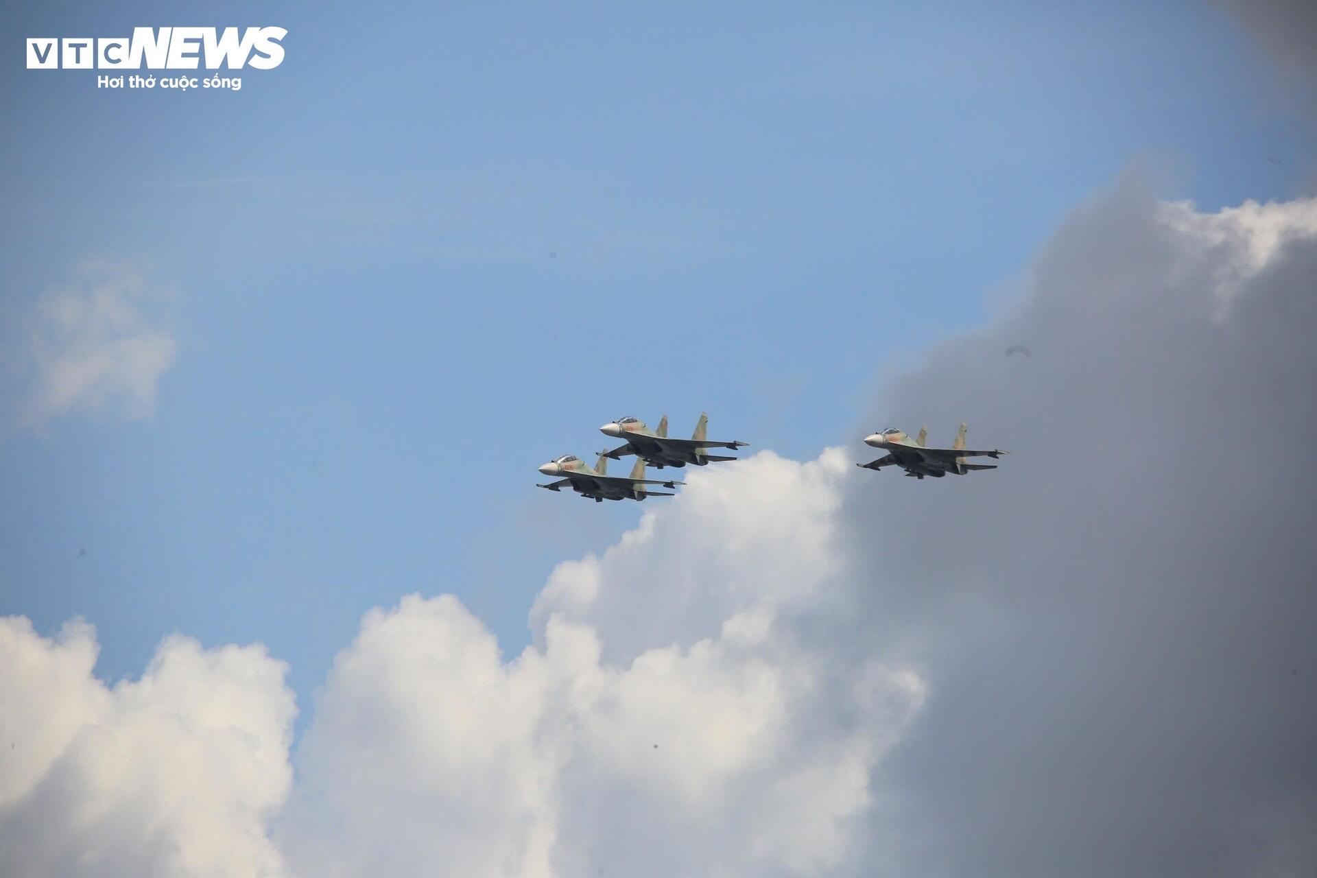 | Các chiến đấu cơ Su-30 bay lướt ngang bầu trời trung tâm, tạo nên tiếng rít xé gió đầy uy lực. Trong khi đó, tiêm kích Yak-130 lướt qua như "xé toạc" không trung. |