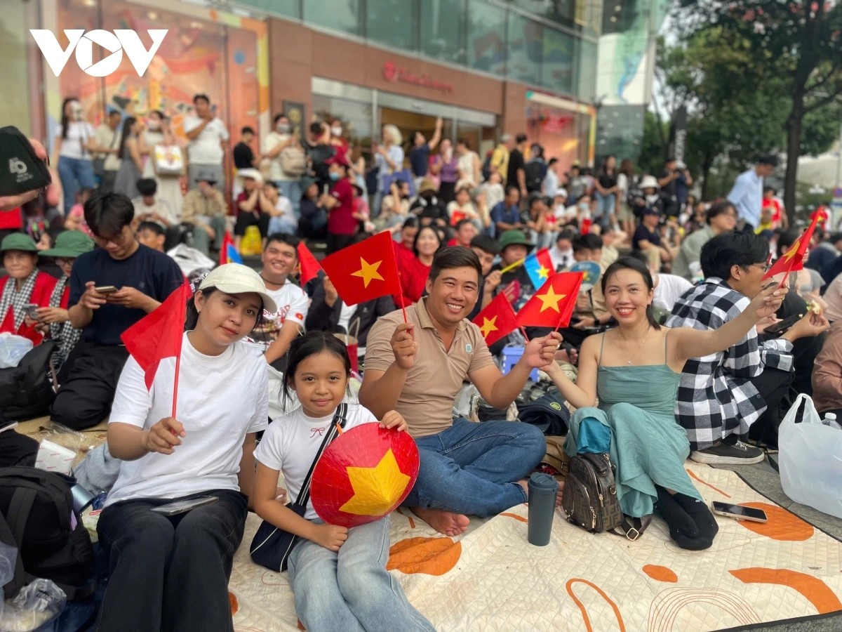 Phóng viên Kim Dung ghi nhận, tại khu vực chợ Bến Thành, biển người chờ đợi xuyên đêm để hòa mình vào không khí của ngày đại lễ. Ngoài khu vực được căng dây ngăn cách để các lực lượng tham gia phục vụ cho lễ kỷ niệm, dường như các phần đường, vỉa hè còn lại đều chật kín người ngay từ đêm qua đến sáng nay.