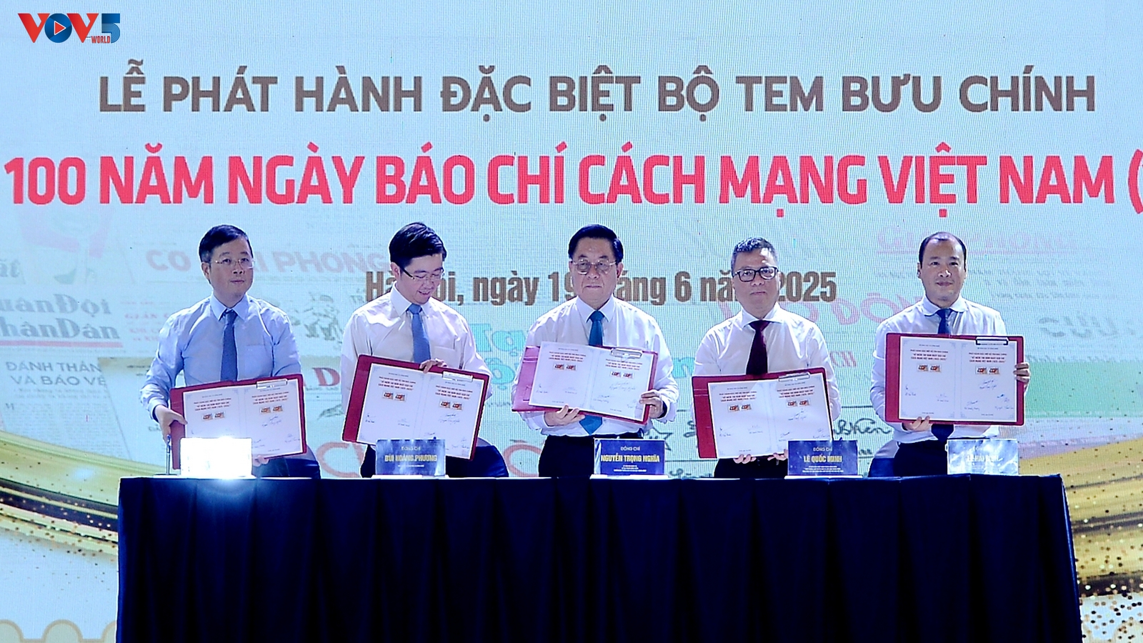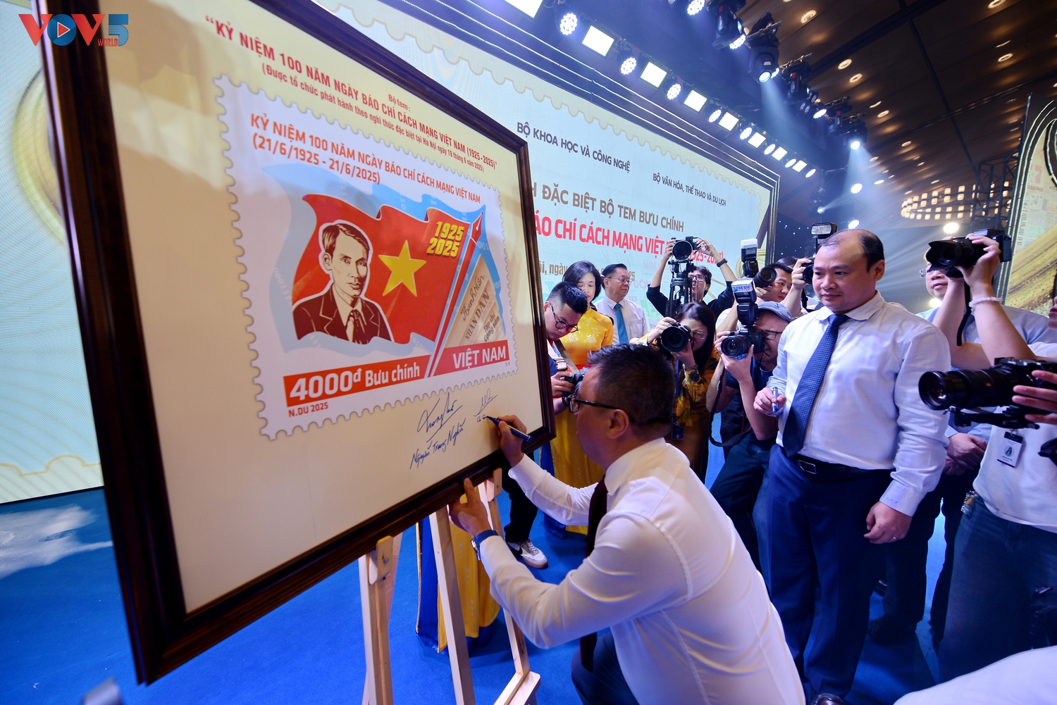 | Cũng tại lễ khai mạc Hội báo, Bộ Khoa học và Công nghệ, Bộ Văn hóa, Thể thao và Du lịch và Hội Nhà báo Việt Nam phối hợp tổ chức lễ phát hành bộ tem kỷ niệm 100 năm Ngày Báo chí cách mạng Việt Nam (21-6-1925 / 21-6-2025). |