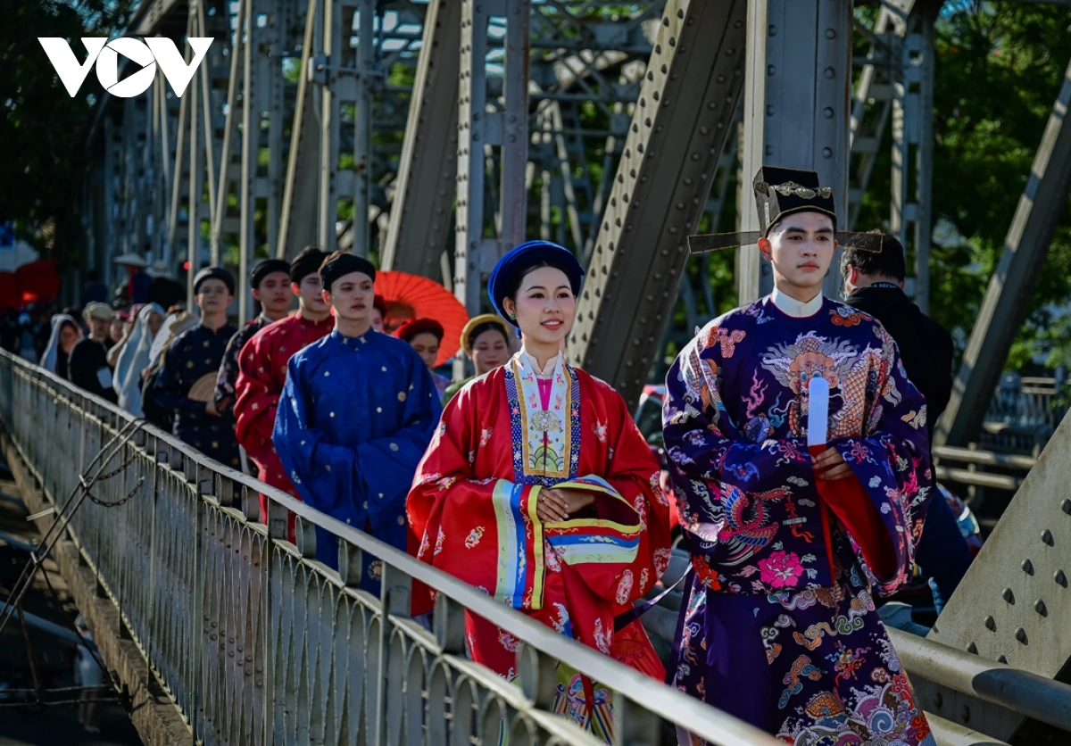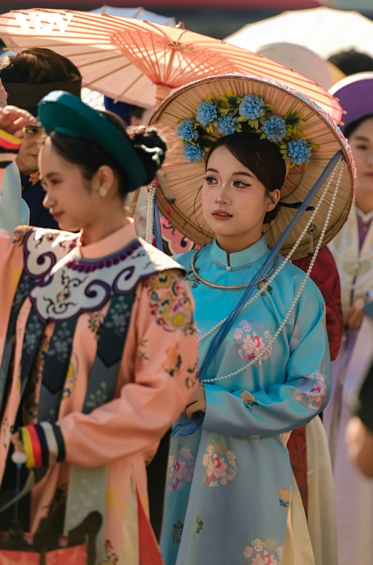 | Một trong những điểm nhấn đầy ấn tượng là khối Ngự giá “Bách hoa bộ hành”. Đây là lần đầu tiên tại Huế, hình ảnh đoàn ngự giá triều Nguyễn được tái hiện sống động trên đường phố, với những kiểu phục trang cung đình được phục dựng dựa trên các tư liệu lịch sử thời Nguyễn cuối thế kỉ XIX – đầu XX như mang theo cả hơi thở cung đình cổ kính trở lại giữa đời thường. Người dân và du khách được tận mắt chiêm ngưỡng những hình ảnh thú vị như lễ rước hoàng hậu hoàng hậu, các quan viên, thị vệ, mệnh phụ, phi tần... hiện lên đầy lộng lẫy, trang nghiêm nhưng không kém phần trang nhã. |
