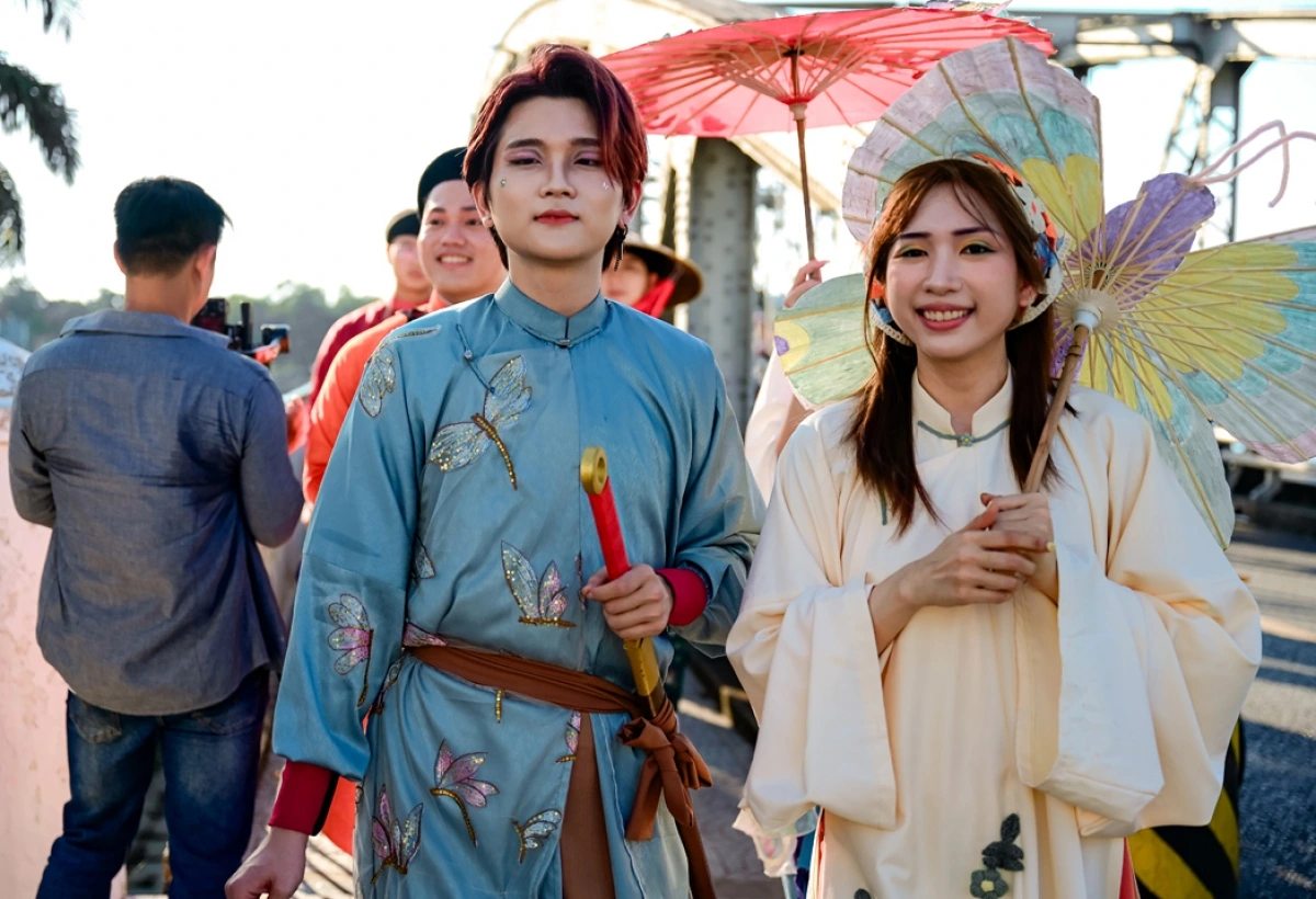 | Cổ phục cung đình Huế qua cầu Trường Tiền. |