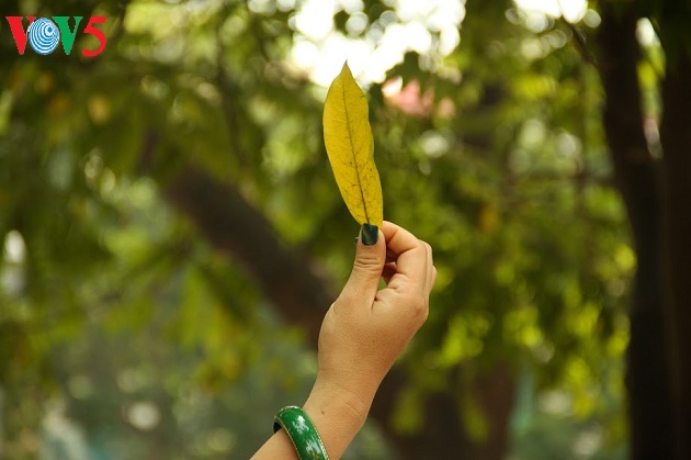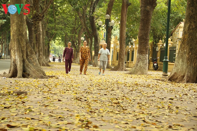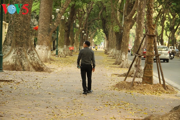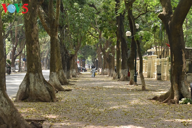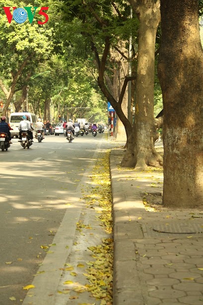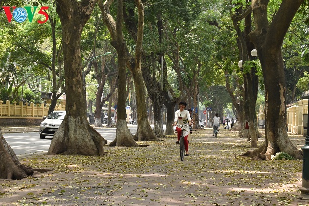 | Điều thú vị của mùa lá rụng ở Hà Nội là cây không trơ trụi mà vẫn rợp lá xanh, che nắng cho người đi đường. |