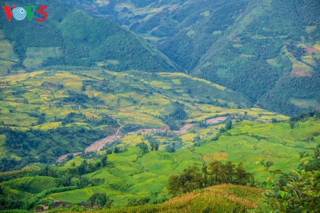 Nhìn từ trên cao (ở Ngải Thầu Thượng), cánh đồng lúa nương Y Tý như bức tranh nhiều màu sắc trên nền xanh của núi rừng