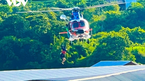 (VOV5) - Vào khoảng hơn 17h ngày 1/8, 8 người dân bị mắc kẹt, cô lập do mưa lũ tại xã Mường Hung, tỉnh Sơn La đã được trực thăng của Bộ Quốc phòng giải cứu.