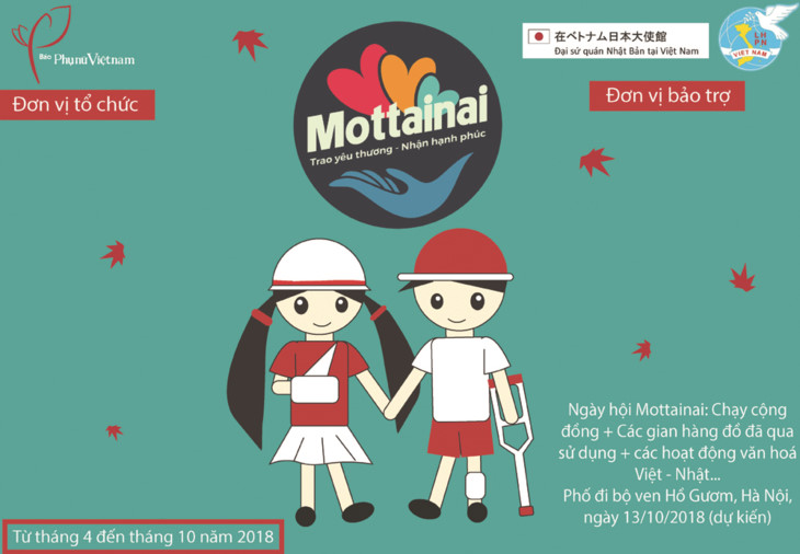 Thiết thực kỷ niệm 45 năm quan hệ ngoại giao Việt Nam – Nhật Bản và 88 năm Ngày thành lập Hội Liên hiệp phụ nữ Việt Nam, sáng nay (13/10), tại Hồ Hoàn Kiếm, Hà Nội, Báo Phụ nữ Việt Nam tổ chức Chương trình Mottainai “Trao yêu thương – nhận hạnh phúc” 2018 vì trẻ mồ côi, trẻ em bị ảnh hưởng bởi tai nạn giao thông.