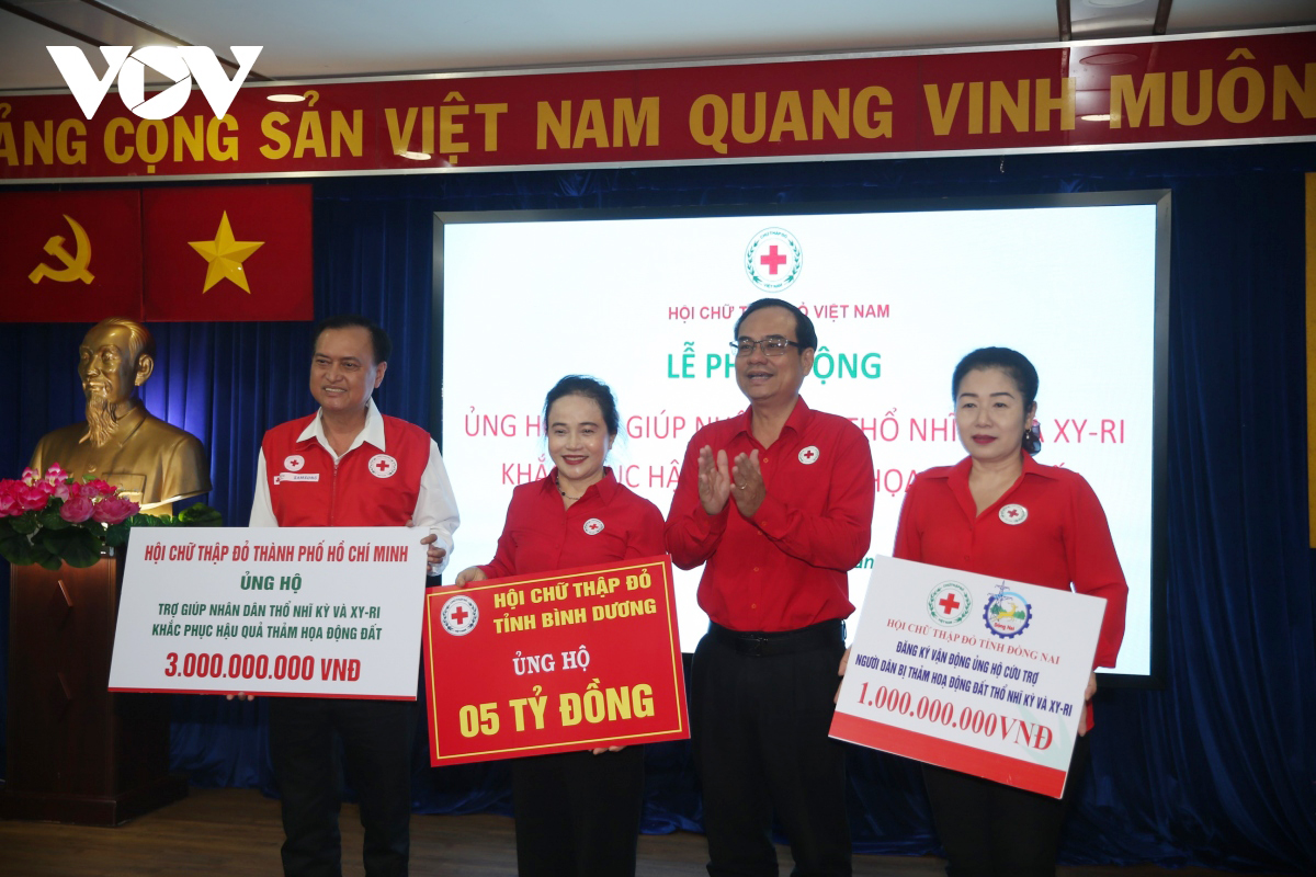 Phó Chủ tịch Trung ương Hội Chữ thập đỏ Việt Nam Vũ Thanh Lưu tiếp nhận ủng hộ từ các đơn vị. Ảnh: VO |