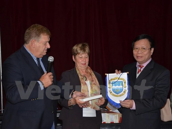 | Thị trưởng thành phố Vigneux-sur-Seine, ông Serge Poinsot, trao quà cho Công sứ Đặng Giang tại buổi lễ. (Ảnh: Bích Hà/Vietnam+) |