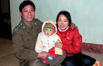 Khác với anh Hoan, trung úy Giàng Mý Dũng trong dịp này có vợ và con vào tận đồn thăm và động viên. Vợ anh là Giàng Thị Xay, vốn là giáo viên mầm non ở Lũng Làn. Năm 2005, anh Dũng về đồn Lũng Làn công tác rồi họ quen nhau, tìm hiểu nhau. Đến cuối 2006 thì cưới nhau. Vợ là người Mèo Vạc, còn chồng là người ở thị xã Hà Giang. Giờ thì họ đã có 1 con trai vừa tròn 1 tuổi. Năm ngoái, vợ chuyển ra Mèo Vạc công tác, vợ chồng đành tạm xa nhau. "Một tháng em và con đều vào thăm anh ấy cùng đồn ít nhất là một lần. Tết thì mẹ con em vào đồn ăn Tết luôn. Mấy hôm nay, em xin nghỉ 2 buổi dạy, đi nhờ xe vào thăm anh, cũng như để chúc mừng đồn nhân ngày truyền thống Bộ đội biên phòng. Con em vào suốt, nên nó cũng quen. Giờ cả đồn, ai bế đi chơi nó cũng cho cả. Mấy anh trong đồn bảo đó là con chung của cả đồn...” – cô giáo Xay tâm sự. Hỏi chuyện, từ cán bộ, chiến sĩ ai cũng bảo đôi đó đẹp. Yêu nhau ở đây, lấy nhau ở đây. Giờ xa nhau tý, nhưng vẫn luôn được gặp.