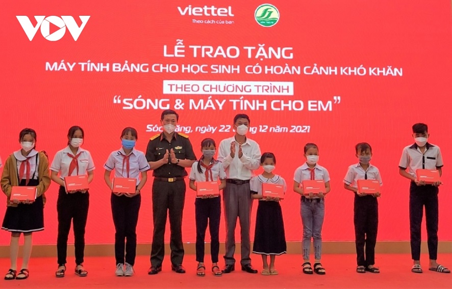 Chiều 22/12, Tập đoàn Công nghiệp – Viễn thông quân đội (Viettel) phối hợp với UBND tỉnh Sóc Trăng tổ chức trao hơn 12.700 nghìn máy tính bảng, kèm theo sim 4G được trao tặng cho học sinh nghèo, có hoàn cảnh đặc biệt khó khăn ở tỉnh Sóc Trăng, với tổng kinh phí 35 tỷ đồng.