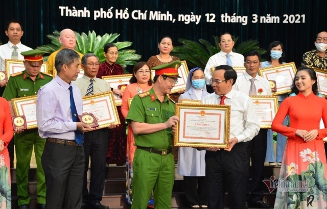 Bí thư Thành ủy Nguyễn Văn Nên tặng bằng khen cho 129 tấm gương tiêu biểu.Ảnh: vietnamnet.vn |