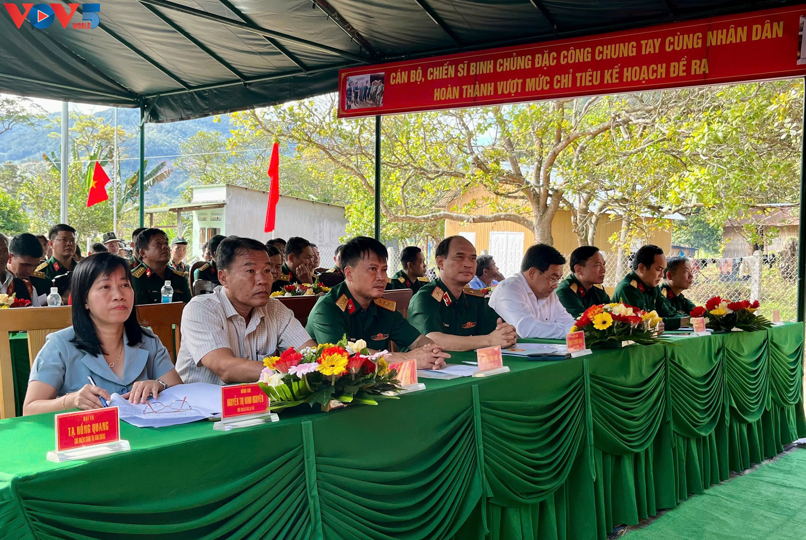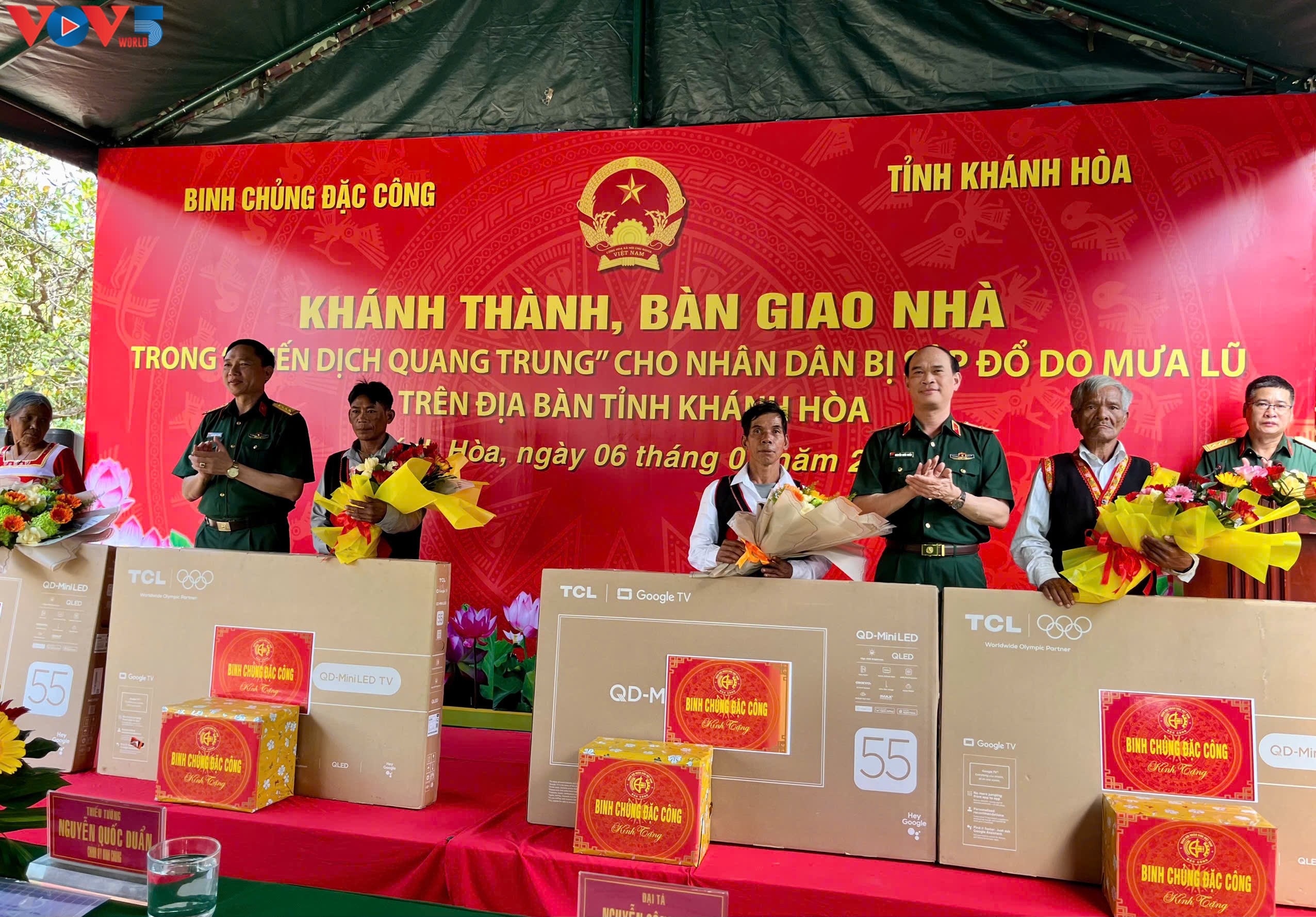 Phát biểu tại buổi lễ, Thiếu tướng Nguyễn Quốc Duẩn, Chính uỷ Binh chủng Đặc công, cho biết: Binh chủng Đặc công triển khai thực hiện nghiêm Nghị quyết và Công điện của Thủ tướng Chính phủ về việc phát động, triển khai “Chiến dịch Quang Trung” thần tốc xây dựng, sửa chữa lại nhà ở cho nhân dân bị thiệt hại do các đợt thiên tai vừa qua trên địa bàn các tỉnh miền Trung: "Với tinh thần ‘Táo bạo, quyết liệt, thần tốc’, ở đâu có khó khăn, nguy hiểm, ở đó có bộ đội, qua gần một tháng thi công, Binh chủng Đặc công đã hoàn thành toàn bộ 48 căn nhà thuộc hai tỉnh Khánh Hòa và Đắk Lắk. Riêng tỉnh Khánh Hòa đã xây mới 21 căn nhà, sửa chữa 9 căn nhà bị hư hỏng nặng. Những ngôi nhà được bàn giao hôm nay tuy chưa thể bù đắp hết những nỗi đau mất mát mà bà con phải trải qua nhưng đó là những tấm lòng, là sự chia sẻ, là niềm tin và hy vọng gửi gắm tới mỗi gia đình. Đây không phải là những bức tường mái ngói đơn thuần mà là những mái ấm tình nghĩa, là điểm tựa để bà con đứng dậy sau thiên tai, vững vàng bước tiếp trên chặng đường phía trước".