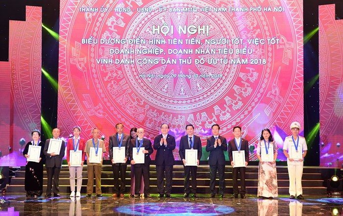 Trưởng ban Tuyên giáo Trung ương Võ Văn Thưởng và Bí thư Thành ủy Hà Nội Hoàng Trung Hải trao tặng Danh hiệu “Công dân Thủ đô ưu tú năm 2018” cho 10 gương mặt công dân ưu tú nhất của Hà Nội.
