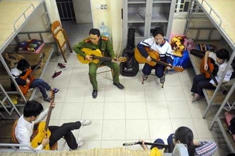 | Thượng úy Trần Anh Tuấn dạy guitar miễn phí cho các học sinh khiếm thị. |