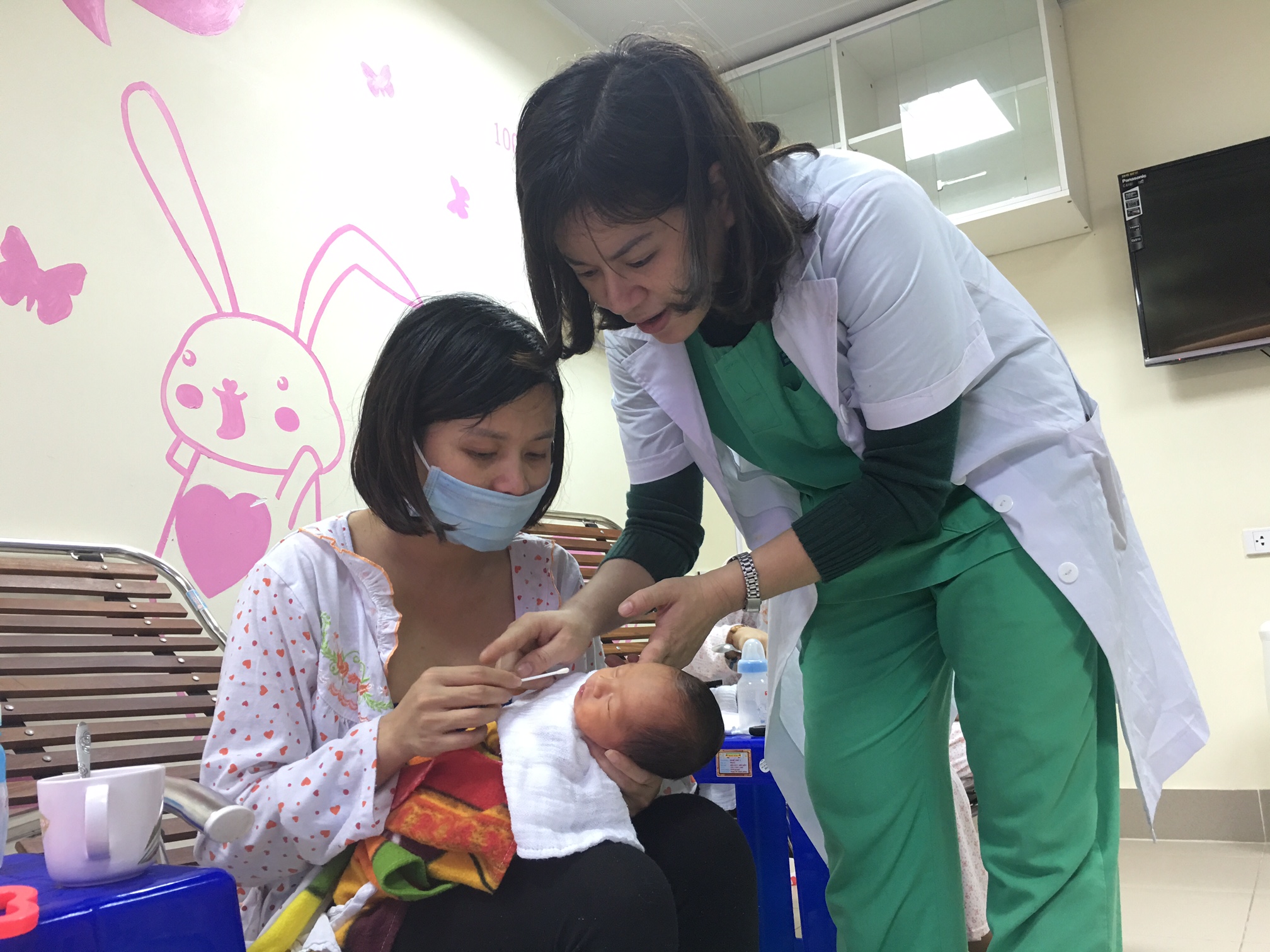 Điều dưỡng trưởng Nguyễn Thị Thu Trang đang hướng dẫn mẹ chăm con. |