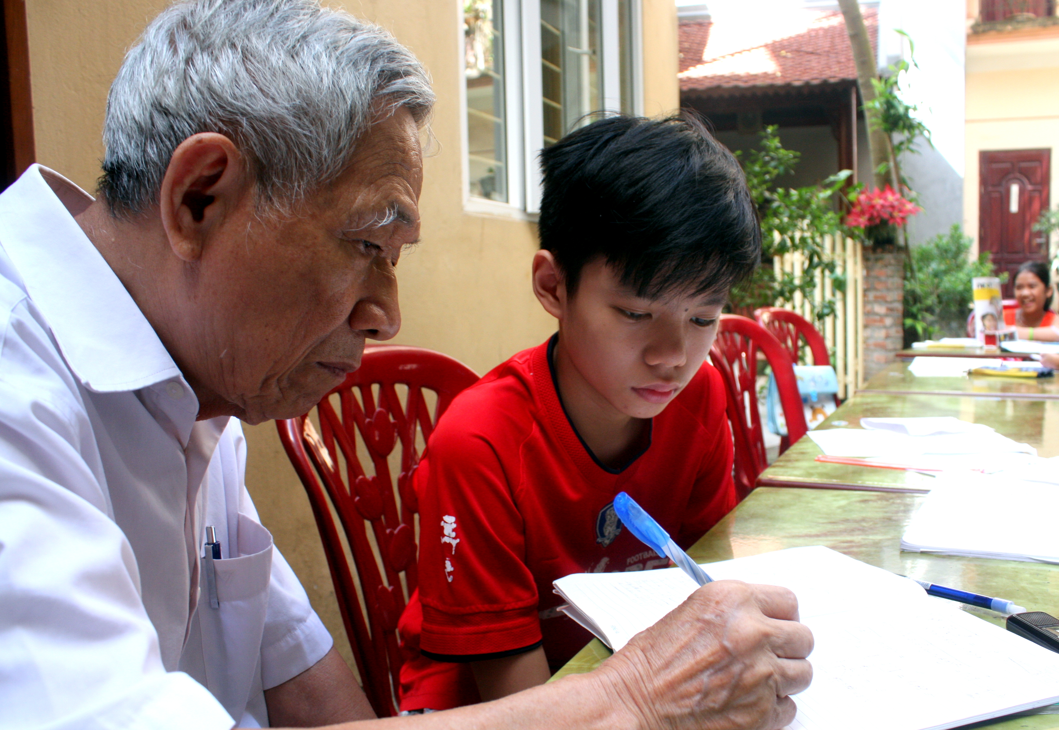 | Thầy giáo Nguyễn Hữu Trà hướng dẫn môn Toán cho một học sinh |