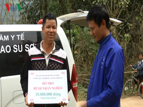Năm 2012, cậu con trai 6 tuổi của anh Ly A Cử, công nhân của đội cao su Pú Bẩu, bị suy thận nặng phải cấp cứu và chuyển lên bệnh viện Nhi Trung ương. Cả gia đình vay mượn, dồn lại cũng chỉ có vài triệu đồng. Quỹ vì bệnh nhân nghèo của Công ty Cổ phần cao su Sơn La đã hỗ trợ gia đình 5 triệu để đi điều trị cho cháu. Đến nay, sức khỏe của cậu con trai dần phục hồi và khỏe mạnh, đã mang lại niềm vui và hạnh phúc cho gia đình. Anh Ly A Cử, Đội cao su Pú Bẩu, xã Chiềng Ngàm, huyện Thuận Châu, tỉnh Sơn La, cho biết: “Thời đấy mình quá khó khăn luôn. Mình không có gì, mình toàn đi vay mượn anh em họ hàng thôi. Cho cháu đi xuống huyện, xuống tỉnh, xuống trung ương, thì được sự giúp đỡ của Công ty Cao su giúp đỡ và hỗ trợ cho gia đình mình được 5 triệu. Mình không biết nói gì hơn, rất cảm ơn Công ty”.