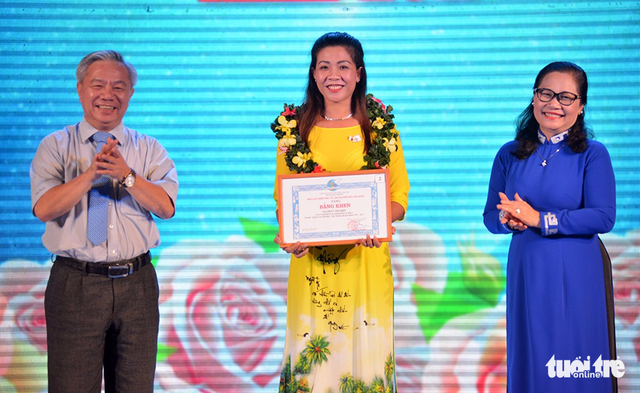 Bà Nguyễn Thị Lệ, trưởng ban Dân vận Thành ủy TP.HCM (phải) trao bằng khen cho bà Trần Thị Hiệp (Q.2) - Ảnh: tuoitre.vn |