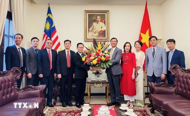 Đại sứ Lào tại Malaysia Thepthavone (thứ 5, bên trái) tặng hoa cán bộ, nhân viên Đại sứ quán Việt Nam. Ảnh: Thành Trung/TTXVN |