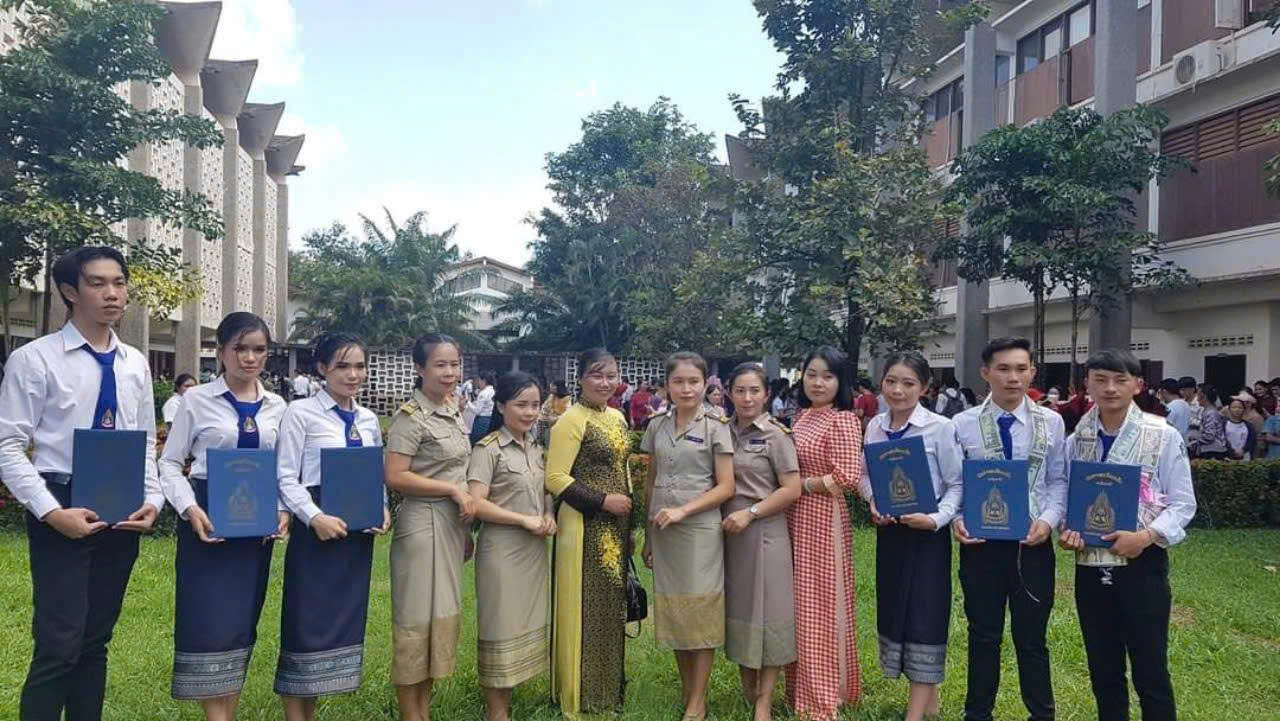 Thạc sĩ Nguyễn Thị Hiền cùng giáo viên và sinh viên khoa tiếng Việt trường Đại học ngôn ngữ, ĐHQG Lào trong ngày lễ nhận bằng tốt nghiệp Đại học năm 2022. |