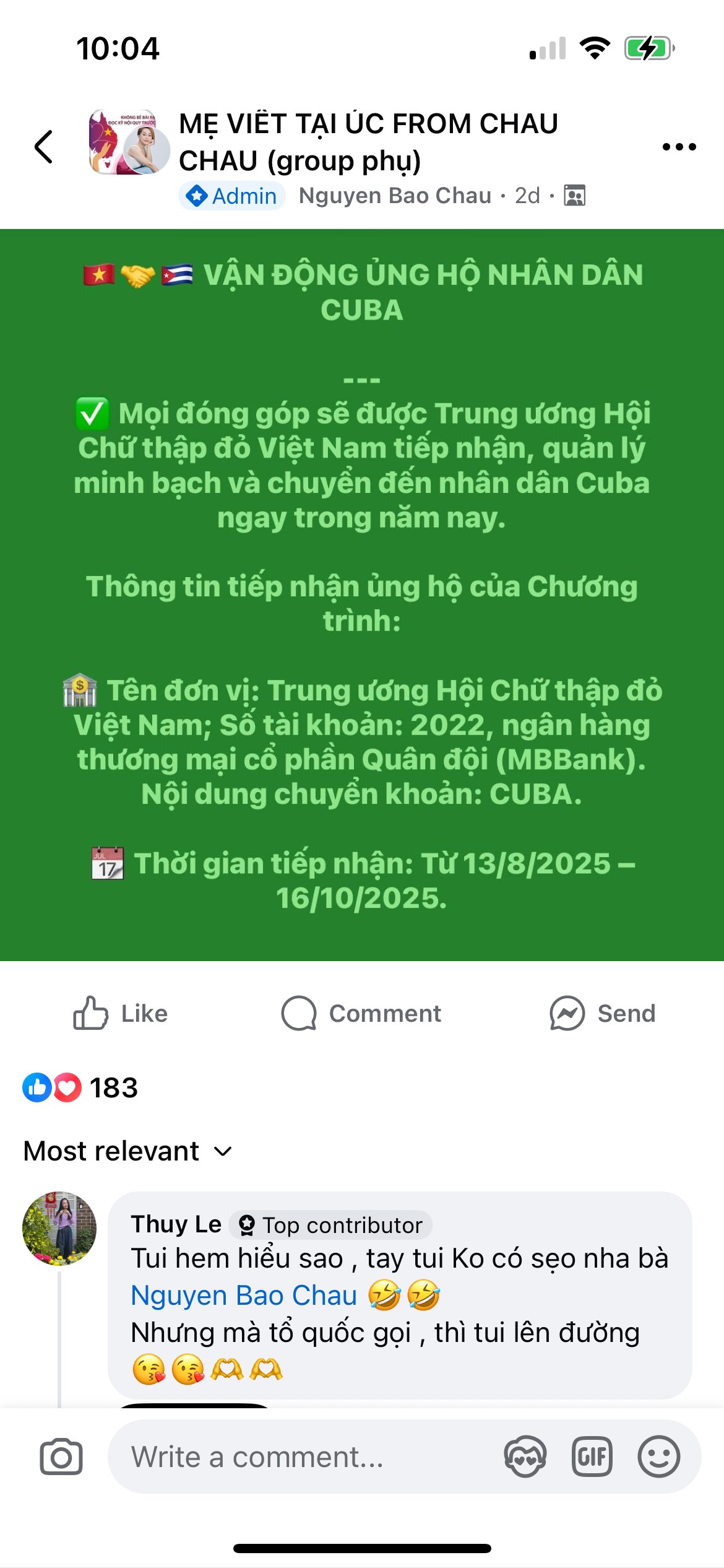 Thông báo quyên góp tiền ủng hộ Cuba trên trang Mẹ Việt tại Úc |