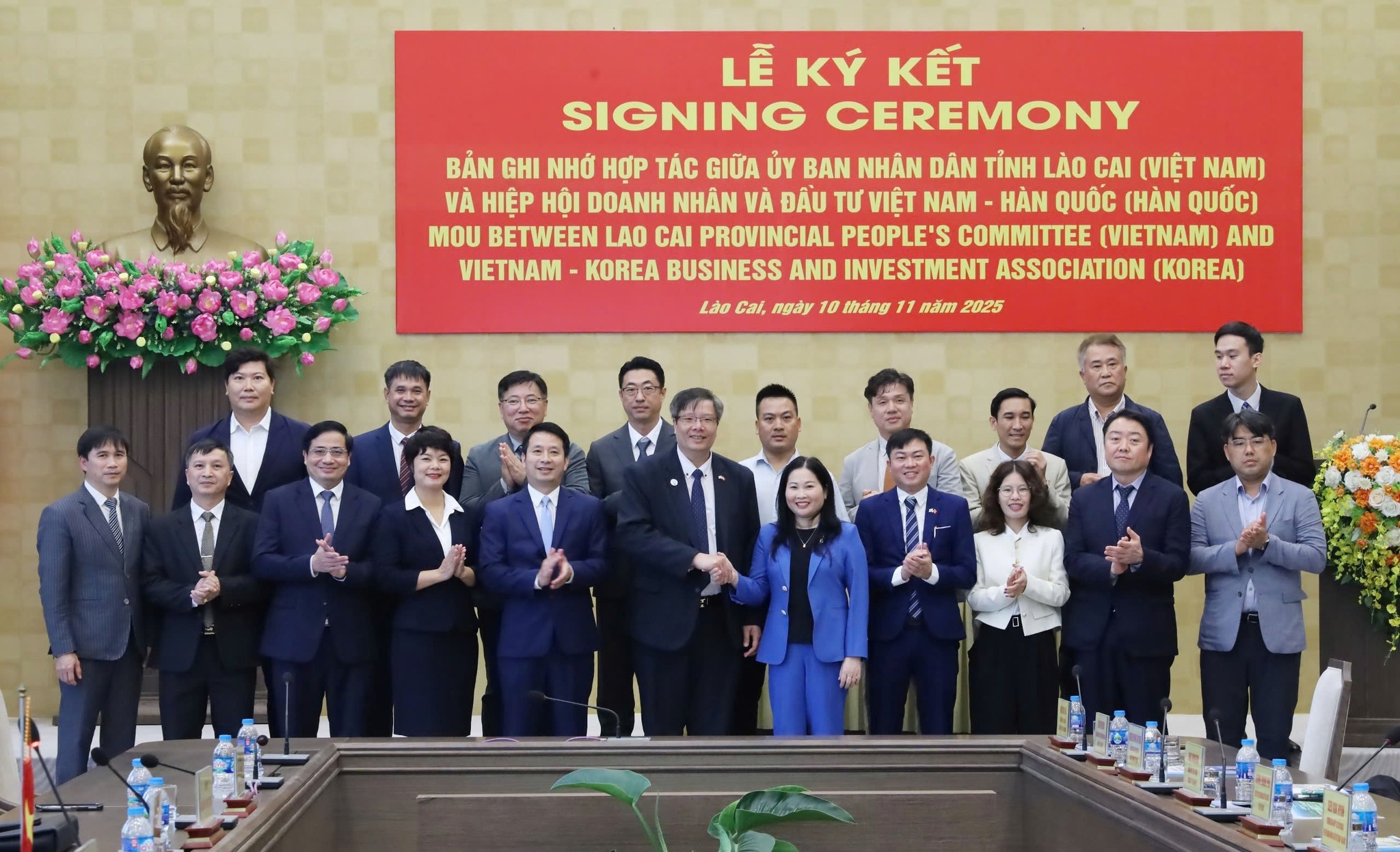 Tại lễ ký kết biên bản ghi nhớ hợp tác với UBND tỉnh Lào Cai, TS. Trần Hải Linh, Chủ tịch Hiệp hội Doanh nhân & Đầu tư Việt Nam - Hàn Quốc (VKBIA), (thứ sáu từ trái sang), cam kết sẽ phối hợp chặt chẽ với UBND tỉnh để tổ chức các hoạt động xúc tiến đầu tư, hỗ trợ doanh nghiệp triển khai dự án, thúc đẩy hợp tác đào tạo nguồn nhân lực, chuyển giao công nghệ và tham gia các chương trình phát triển kinh tế - xã hội tại địa phương. |