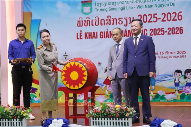 Hiệu trưởng Trường song ngữ Lào - Việt Nam Nguyễn Du Nguyễn Thị Thanh Hương đánh trống khai giảng năm học mới 2025-2026. Ảnh: Xuân Tú/PV TTXVN tại Lào |