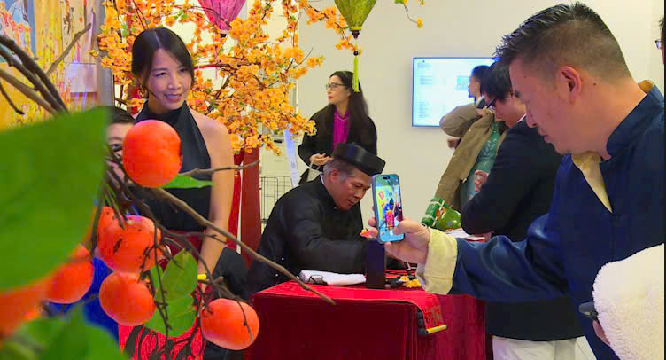 Bà con xin chụp hình với Thầy đồ tại tiệc Xuân đón chào năm mới do Đại sứ quán Việt Nam tại Mỹ tổ chức. Bà con háo hức vì lần đầu tiên có một Thầy đồ “thật” tại tiệc Xuân như vậy |