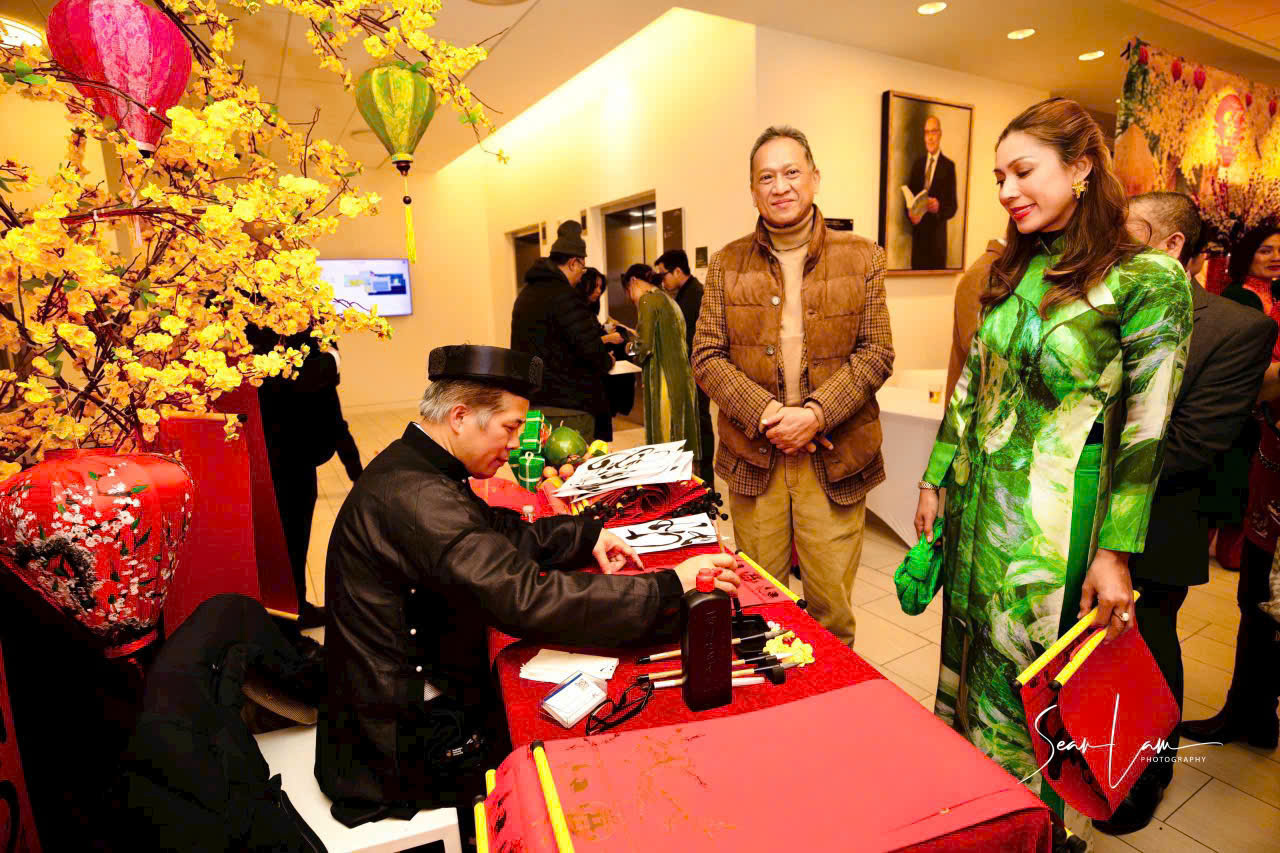 Vợ chồng Đại sứ Malaysia cũng háo hức xin chữ Thầy đồ tại tiệc Xuân đón chào năm mới do Đại sứ quán Việt Nam tại Mỹ tổ chức. |