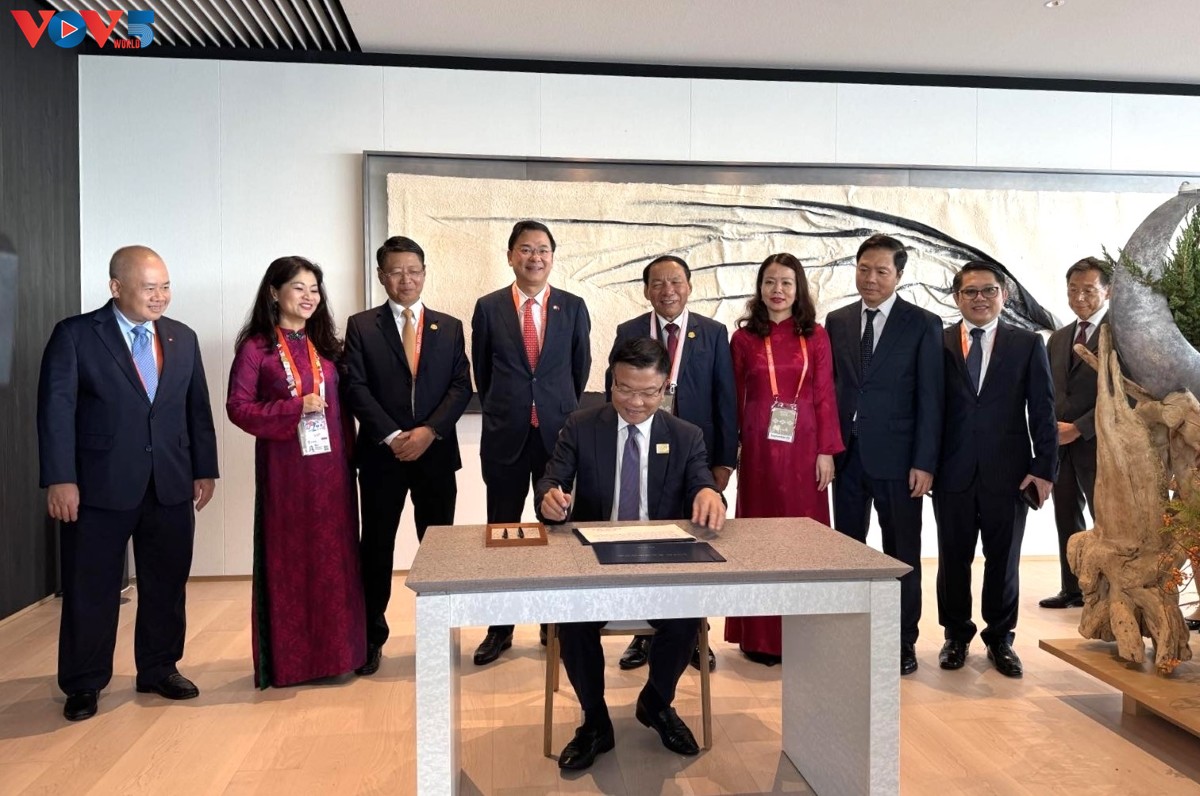 Phó Thủ tướng Lê Thành Long và đoàn công tác ký Sổ lưu bút tại Triển lãm Quốc tế Osaka 2025. Ảnh: PV/VOV-Tokyo |