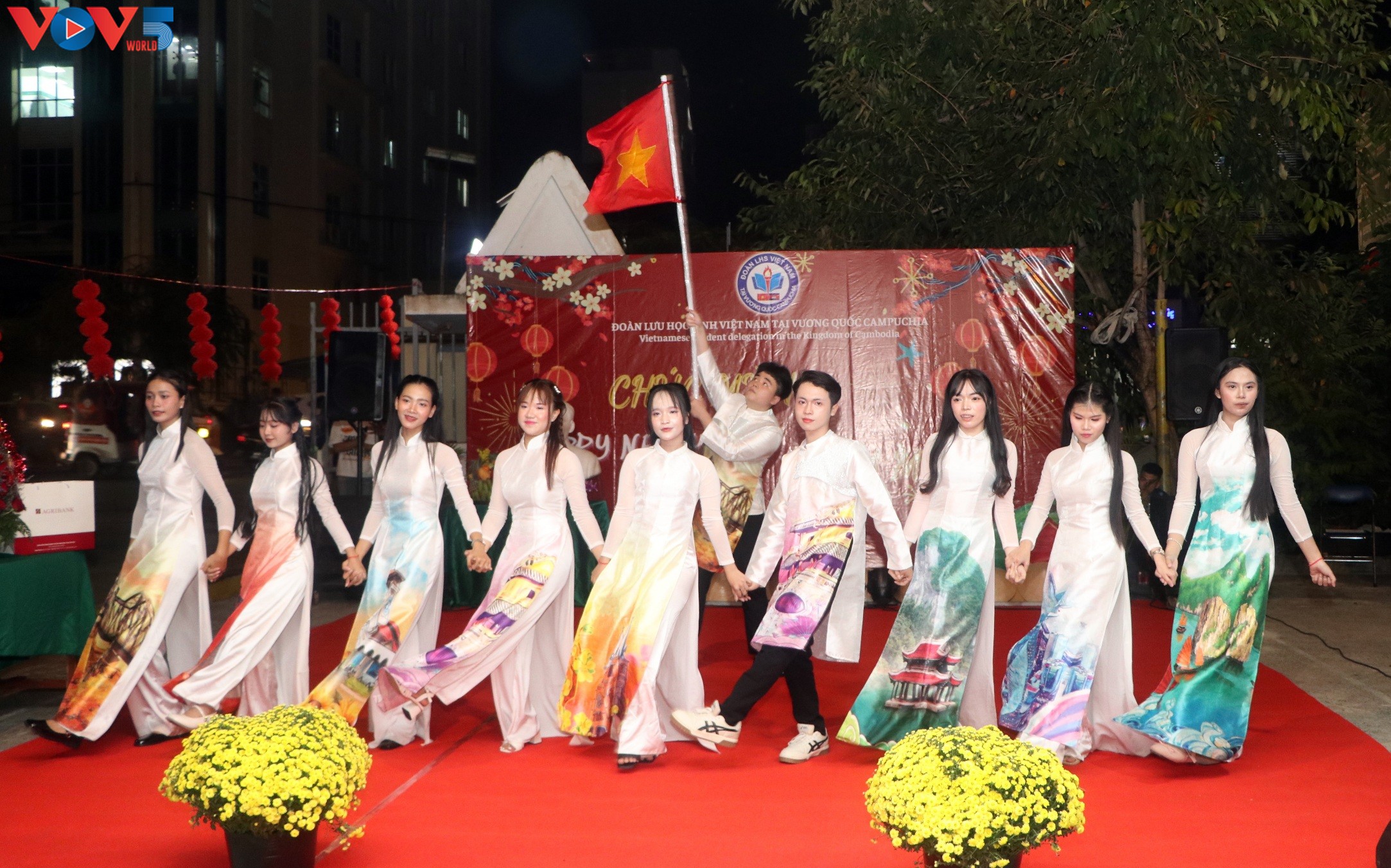 Dịp này, tập thể lưu học sinh Việt Nam tại Campuchia đã trình diễn các tiết mục văn nghệ với những bài ca, điệu múa ca ngợi quê hương đất nước; giới thiệu những món ăn truyền thống trong ngày Tết Nguyên đán của dân tộc Việt Nam tới các khách mời.