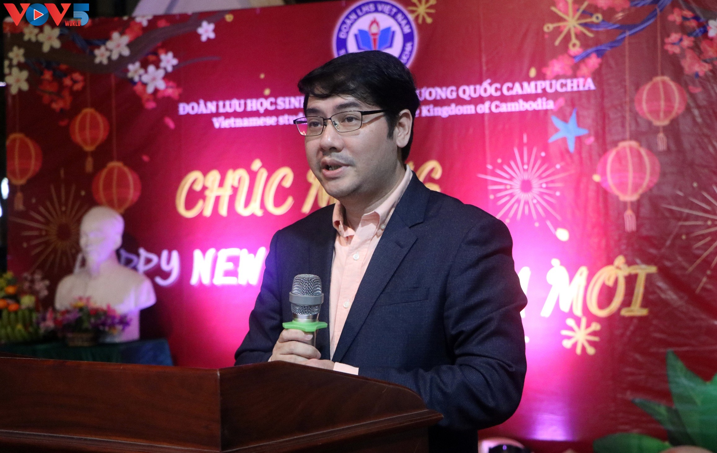 Tham tán Nguyễn Hữu Phú gửi lời chúc Năm mới tốt đẹp nhất đến các đại biểu, khách mời quốc tế, lưu học sinh Việt Nam tại Campuchia. Ảnh: VOV