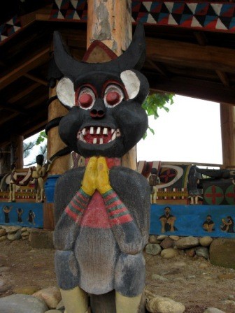 Dễ nhận thấy nhất quanh ngôi nhà mồ là rất nhiều mặt nạ giữ tợn được tô màu đen, đỏ. Người Cơ Tu gọi đó là Cơ Pêy. Người già bảo rằng những chiếc mặt nạ ấy được đục đẽo nhằm xua đuổi tà ma, ngăn chặn những điều xấu xa, bảo vệ linh hồn cho người quá cố. Bên cạnh đó còn có hình ảnh con rồng mình rắn, đầu gà trống, đuôi như cá, được khắc họa từ mặt trước ra mặt sau nhà mồ, là một biểu tượng mang tính giáo dục. Nó đại diện cho thần nước chuyên điều trị mọi sự xấu xa, bảo về bình an cho dân làng cũng như linh hồn của người quá cố. Anh A Đa Nhắt cho biết: Già làng thường lấy hình ảnh con rồng này để giáo dục mọi người trong làng để ăn ở biết trước biết sau. Ăn ở đừng thất đức với người khác nếu không sẽ bị con rồng này nó trị.