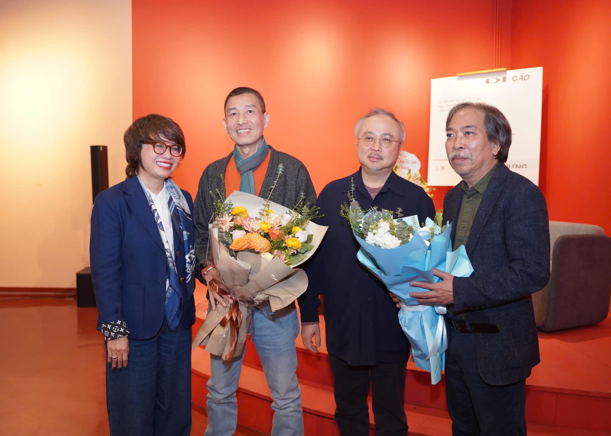 Từ bên phải qua: nhà thơ Nguyễn Quang Thiều, nhạc sĩ Đặng Thái Sơn (con trai nhà thơ Đặng Đình Hưng), họa sĩ Lê Thiết Cương. |