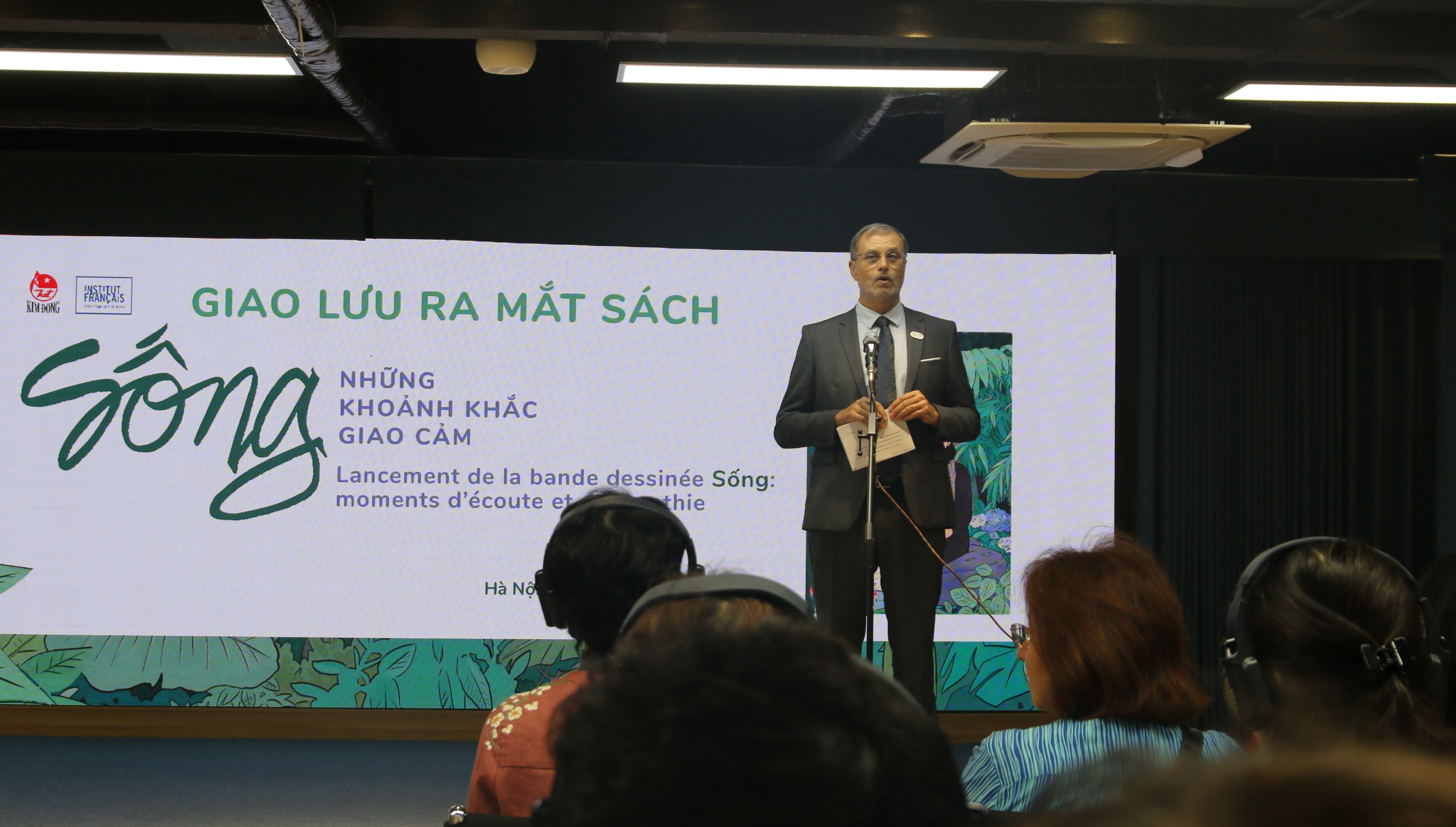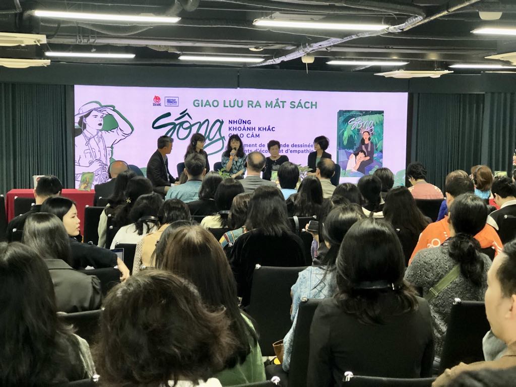 Các tác giả và khách mời tại buổi ra mắt tiểu thuyết bằng tranh Sống, bản tiếng Việt, tại NXB Kim Đồng sáng 12/03/2024 |